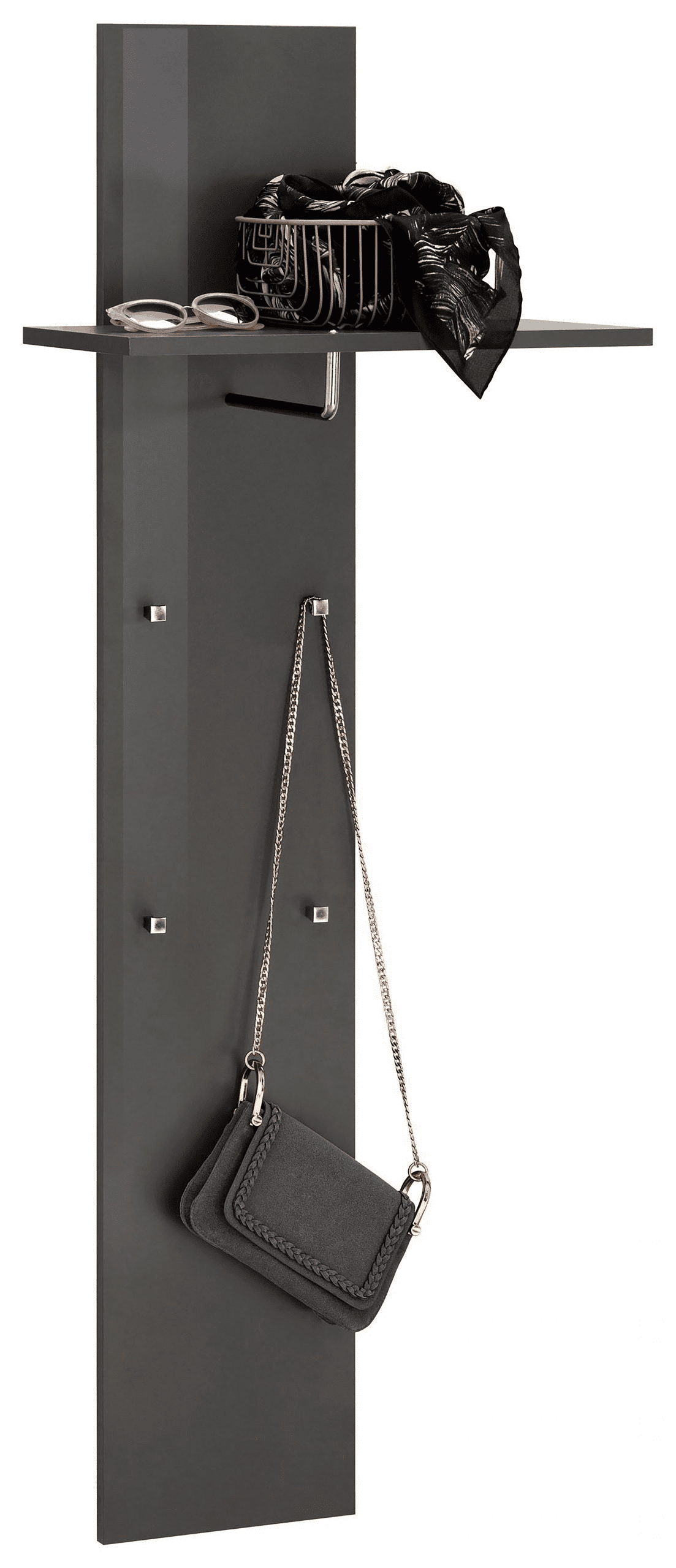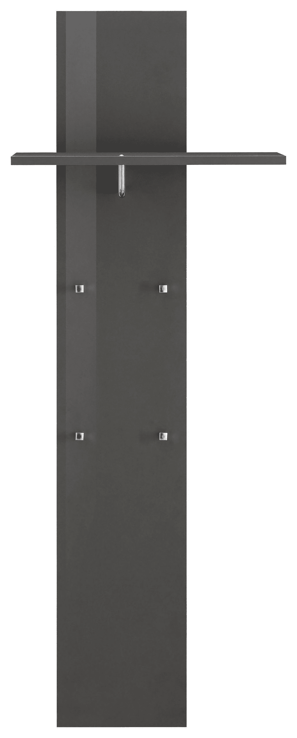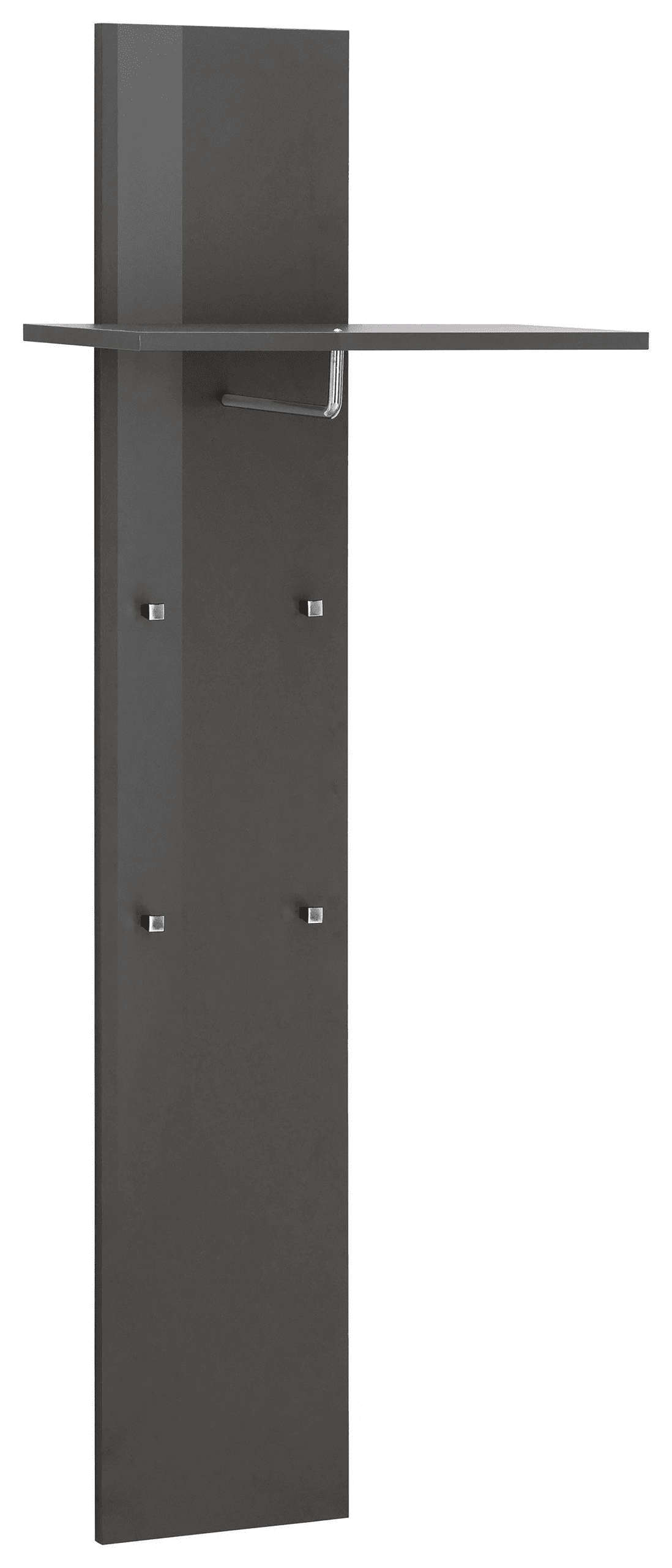 Il pannello appendiabito è composto da un pannello/schiena e da un ripiano porta oggetti oltre a un’asta appendiabito in metallo e 4 pomoli.