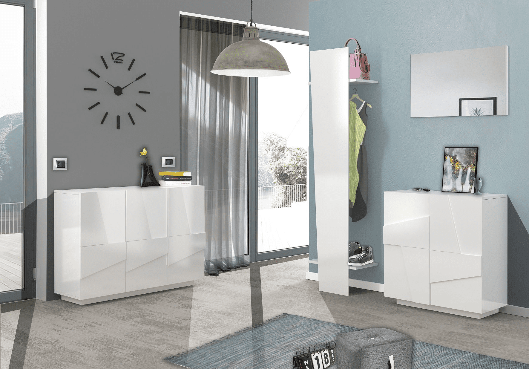 Il pannello frontale è tagliato in diagonale e dietro ha due ripiani in legno con un’asta appendiabito.