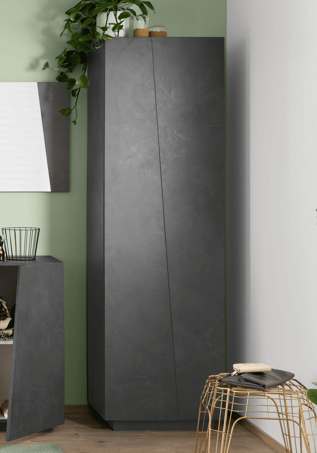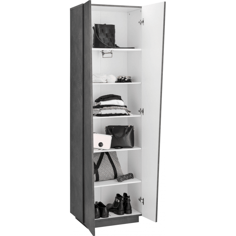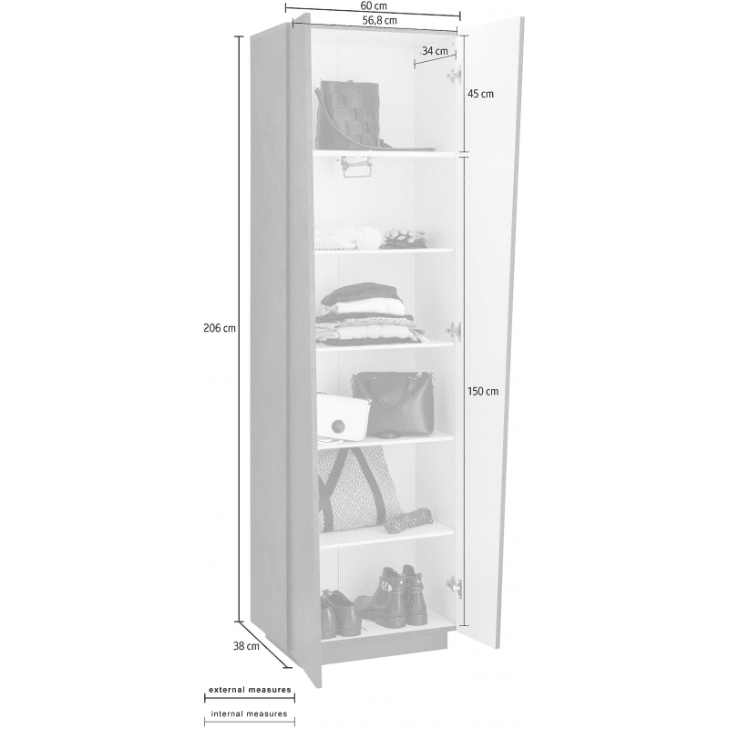È dotato di 2 ante con taglio in diagonale e all’interno è fornito di 5 ripiani in legno ed un’asta appendiabito.