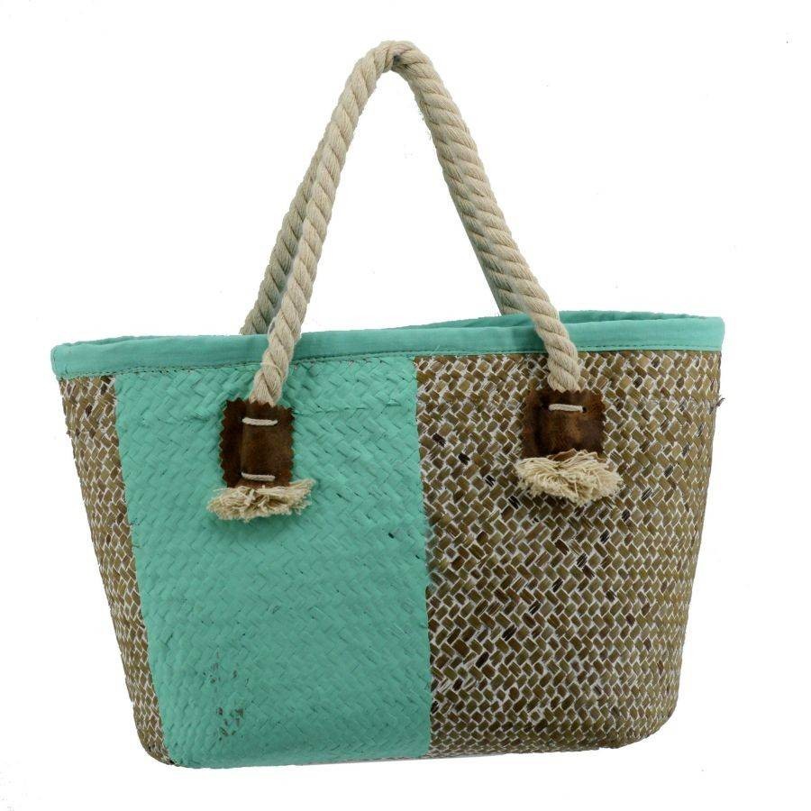 La borsa è in paglia intrecciata, con ampi e comodi manici in corda, che aiutano ad accentuare lo stile natural della borsa.