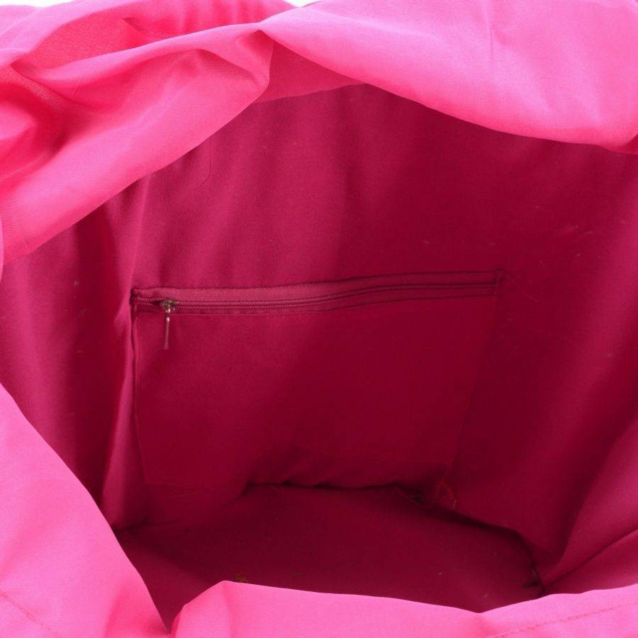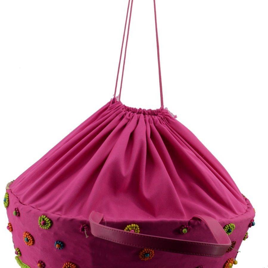 La borsa in paglia naturale ha un design unico, con una parte in stoffa con delle frange e delle perle sul fronte. All’interno è di colore blu ed è dotata di una tasca portaoggetti con cerniera.