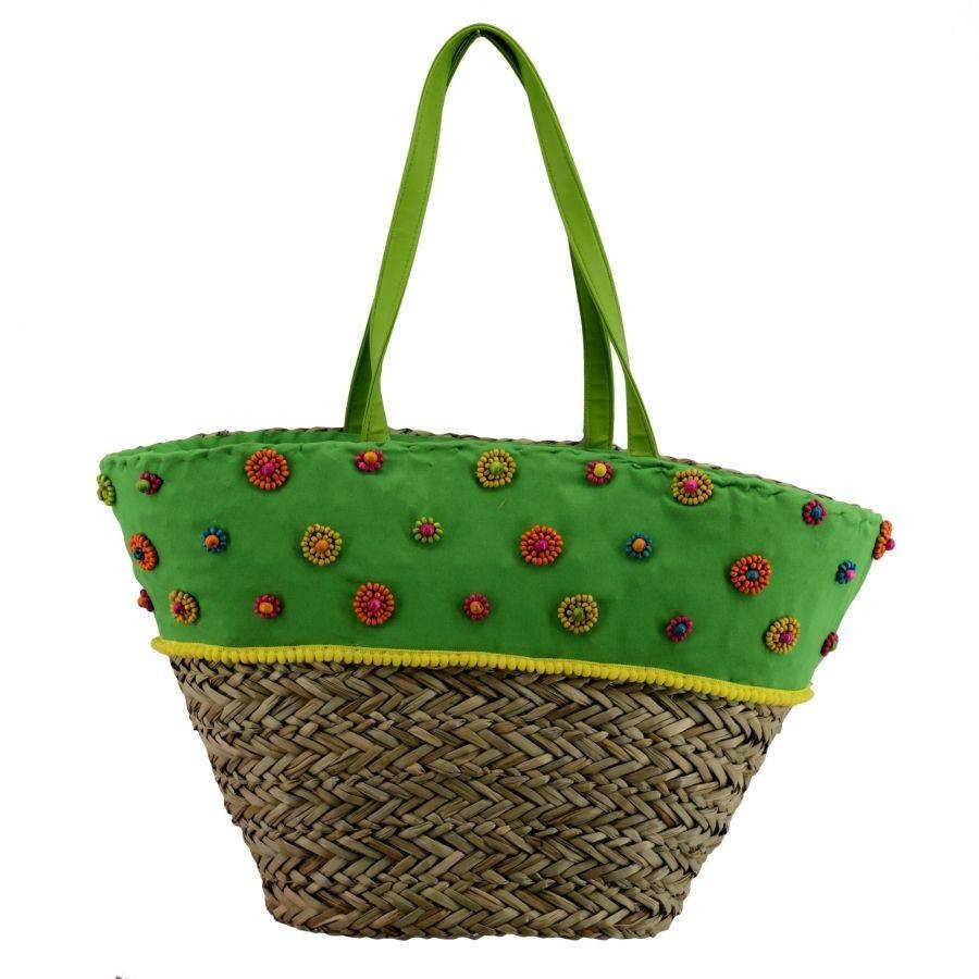 La borsa verde ha un design unico, con una parte in stoffa di colore verde e delle perle sul fronte. All’interno è di colore fucsia ed è dotata di una tasca portaoggetti con cerniera.