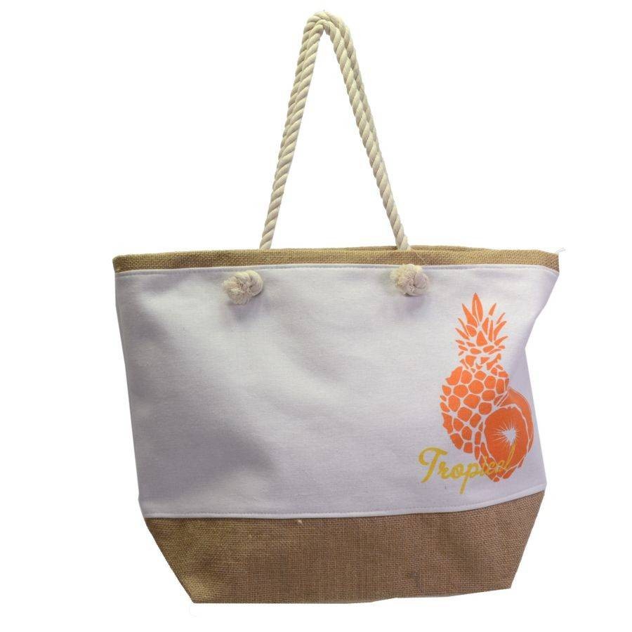 Questa borsa in tessuto bianco e juta naturale combina la praticità alla spensieratezza e all’allegria della decorazione di un ananas stampato.