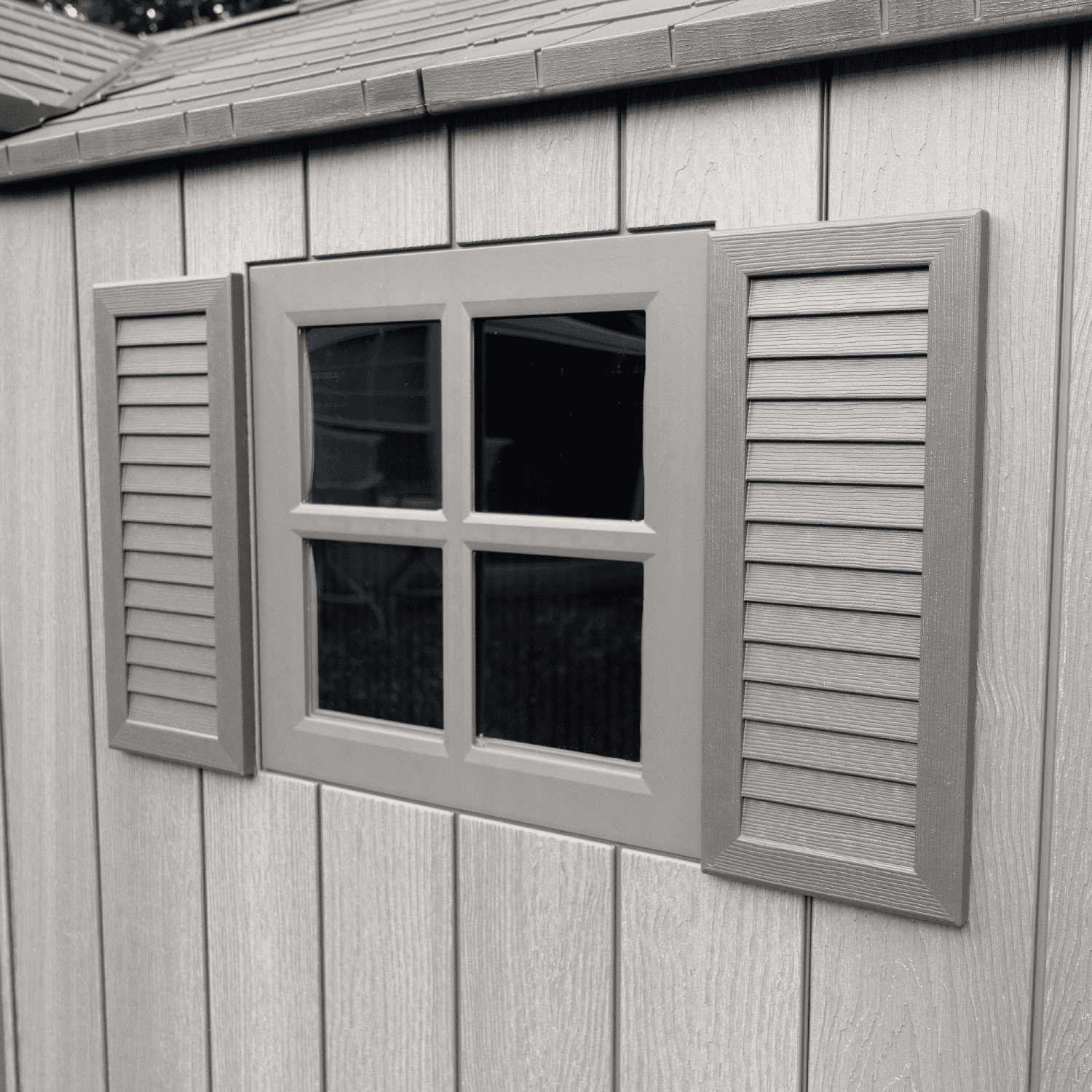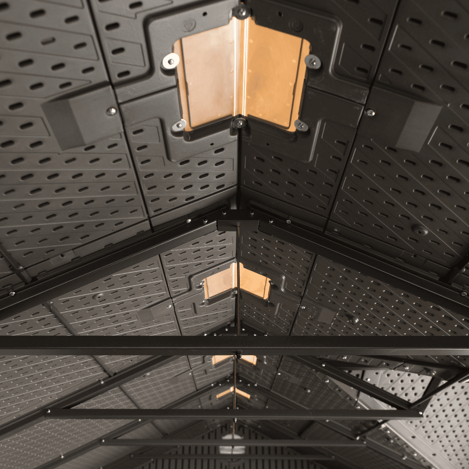 Colore grigio con venature effetto legno, finitura spazzolata ruvida. Tetto realizzato con capriate in acciaio e dotato