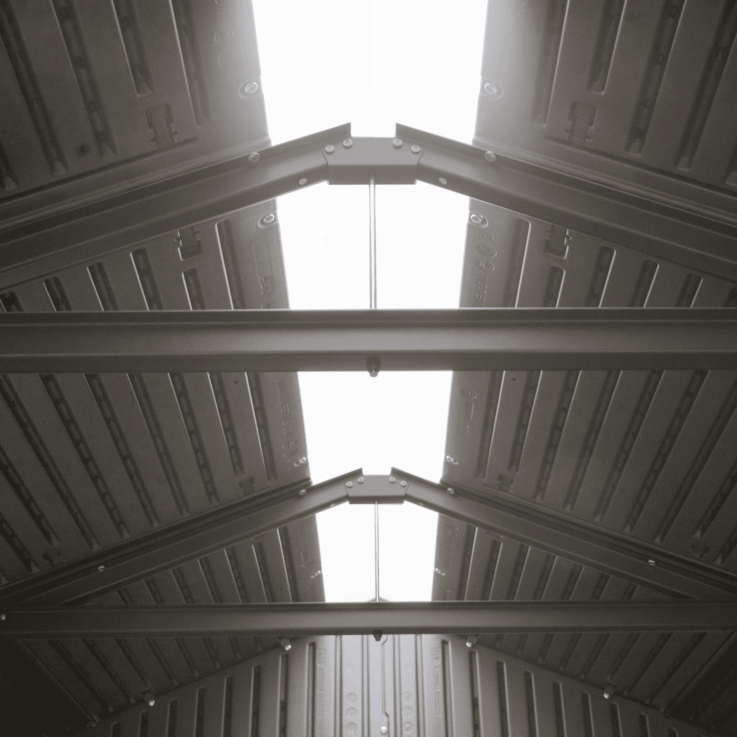 Colore grigio con venature effetto legno, finitura spazzolata ruvida. Tetto realizzato con capriate in acciaio e dotato