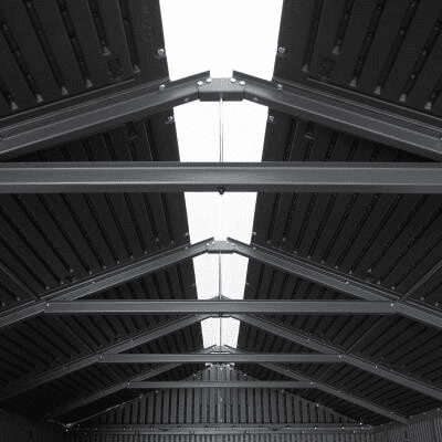Colore grigio con venature effetto legno, finitura spazzolata ruvida. Tetto realizzato con capriate in acciaio e dotato