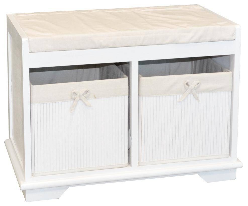 Il modello Perla di Preda è in compensato di legno ricoperto con trafilato di bamboo verniciato bianco. E’ formato da una seduta con 2 cassetti, foderati con stoffa in cotone.