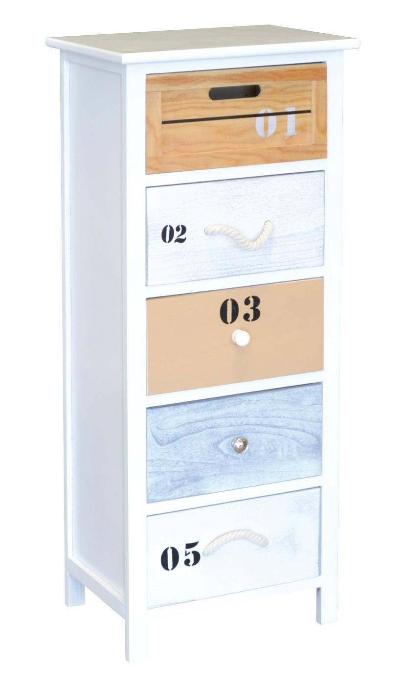 Il modello è in legno verniciato nel colore del blu, bianco e color legno con 5 cassetti numerati dotati di maniglia che varia in ogni cassetto.