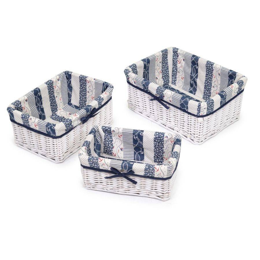 I cassetti in vimini intrecciato sono perfetti da inserire come scomparti negli armadi, oppure come semplici portaoggetti sopra le mensole, hanno una fodera di colore bianco con dei decori azzurri e rossi.