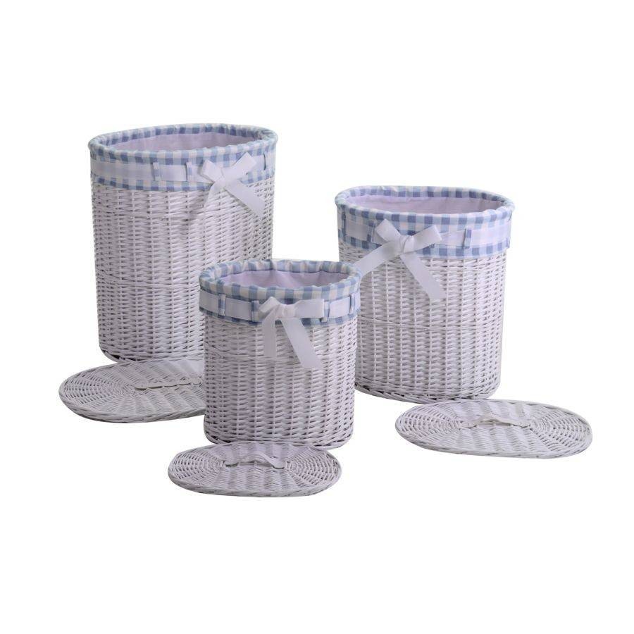 In salotto e nell’ingresso, fai ordine e integra l’arredamento con una comoda cesta portaoggetti. Il set di ceste è composto da tre contenitori di forma ovale in vimini di colore bianco con un fiocco sul davanti ed una fodera a quadretti nella tinta del lilla.