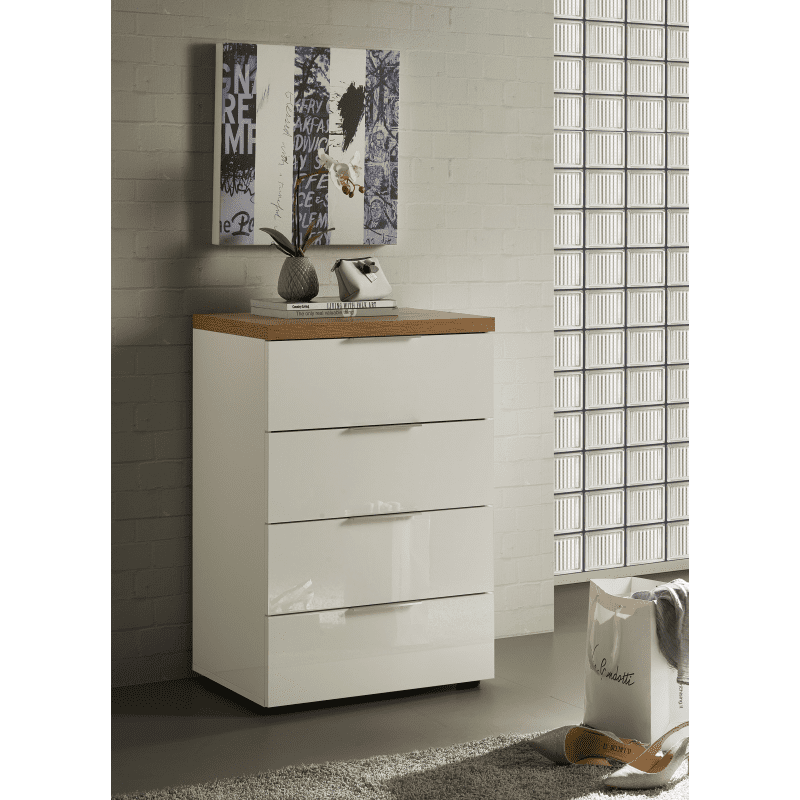 Questa cassettiera comò 4 cassetti è ideale per arredare la camera da letto in coordinato con il comodino della stessa linea, ma si adatta perfettamente anche ad altre stanze. Con una profondità di 43 cm, offre un design moderno ed essenziale, caratterizzato dal bianco lucido e dal top in finitura rovere.
