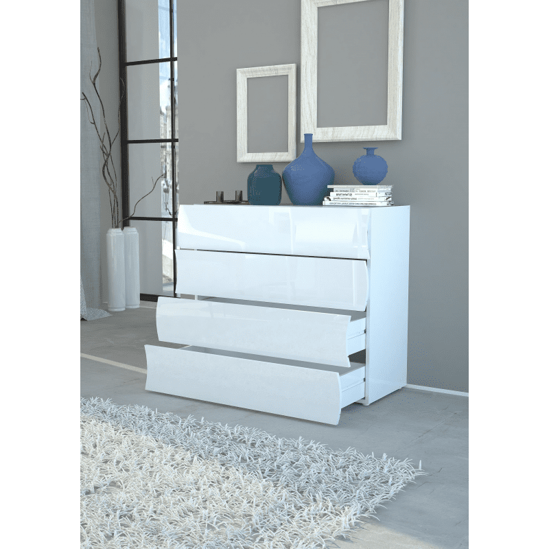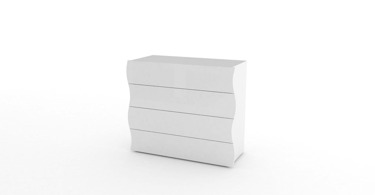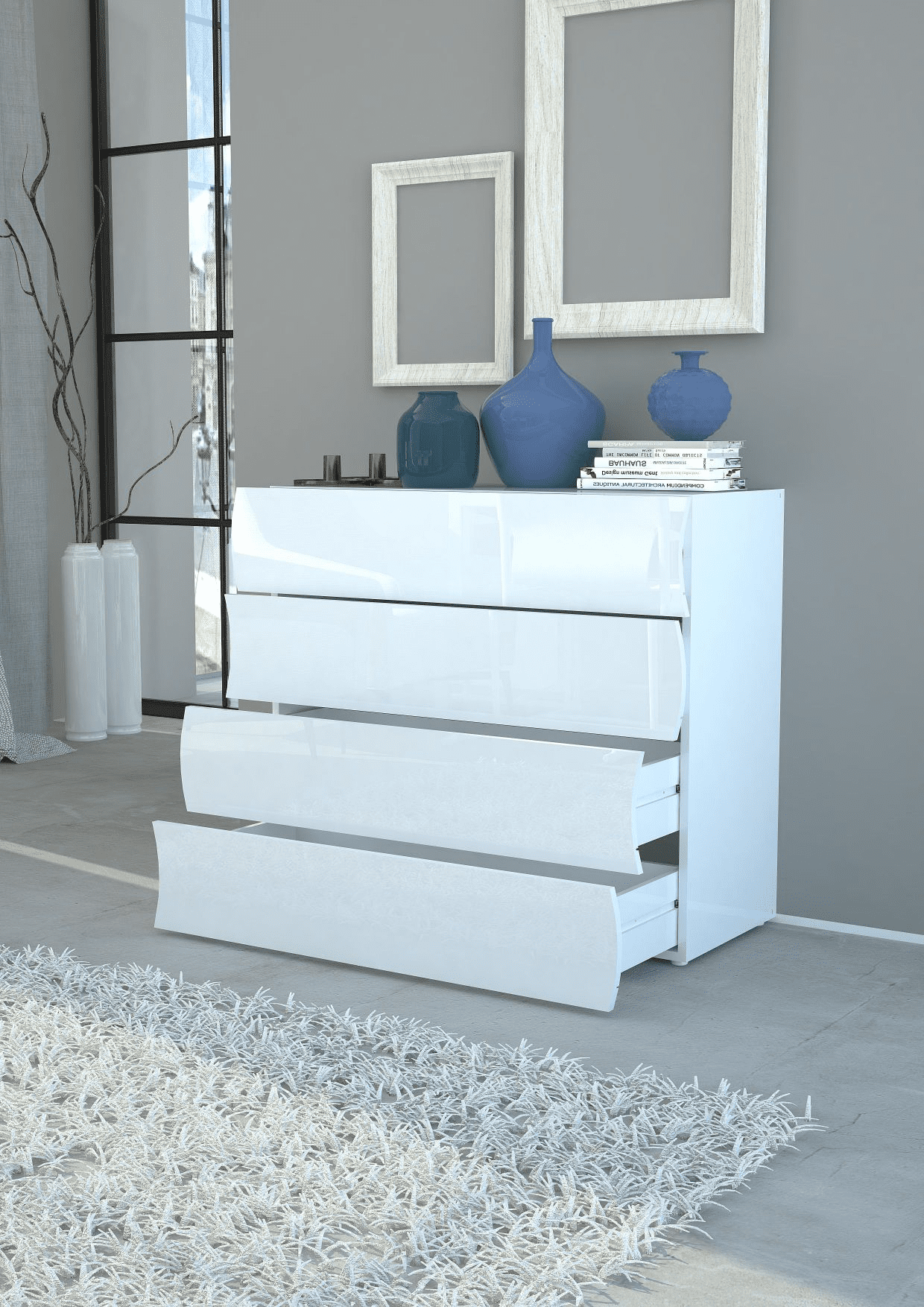 La struttura e i cassetti sono in melaminico laccato bianco lucido.