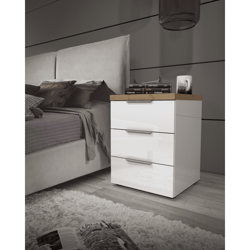 Comodino moderno alto 55 cm, con 3 cassetti in elegante bianco lucido e top in finitura rovere, perfetto per la tua camera da letto. Realizzato in Italia, combina stile e praticità, offrendo ampio spazio di archiviazione.