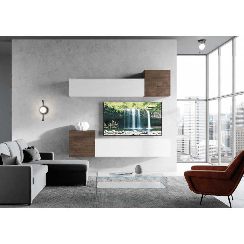 La parete attrezzata Isoka A37 è composta da due elementi semplici ripetuti in alto e in basso, sopra e sotto la TV.