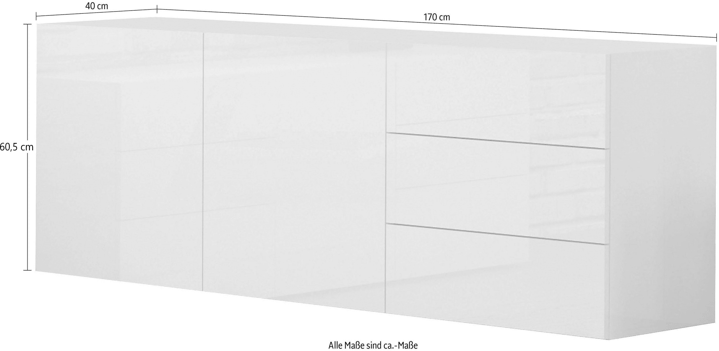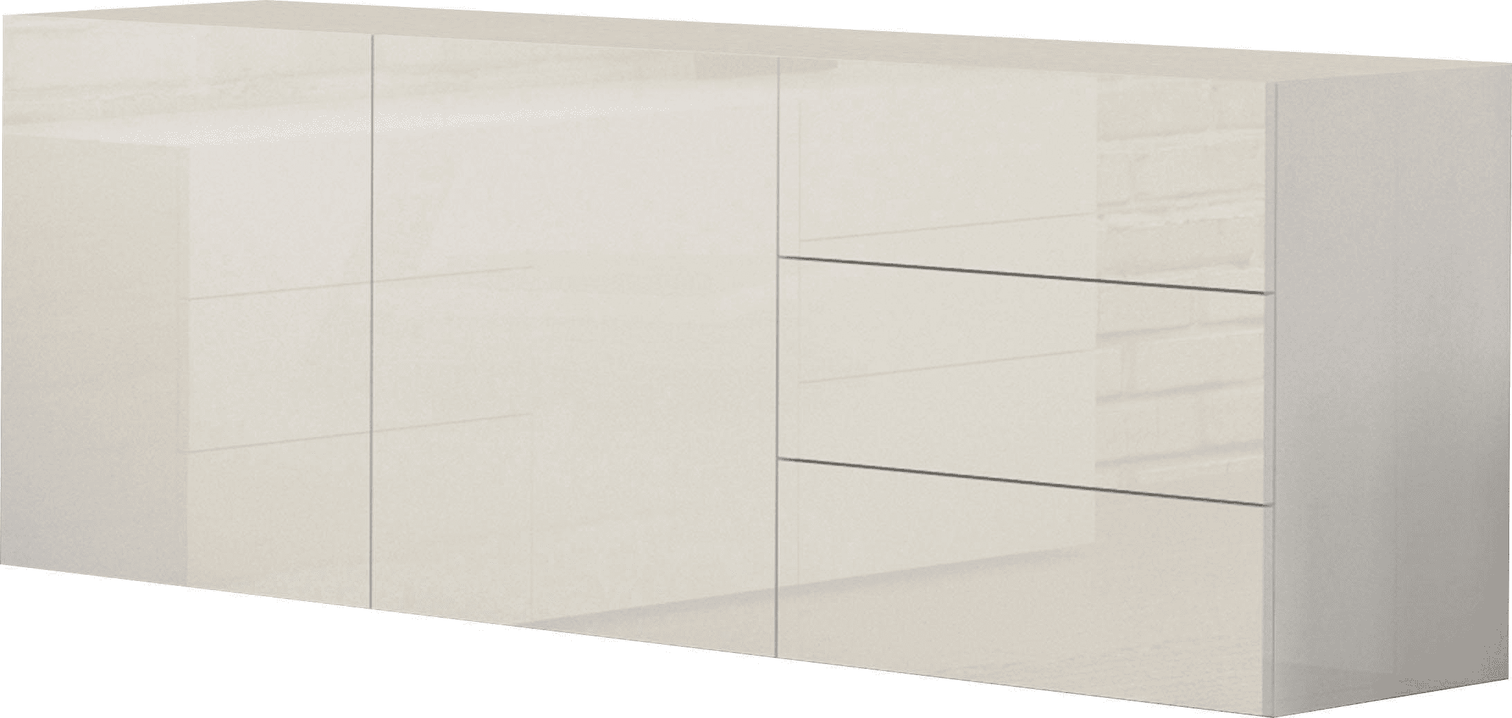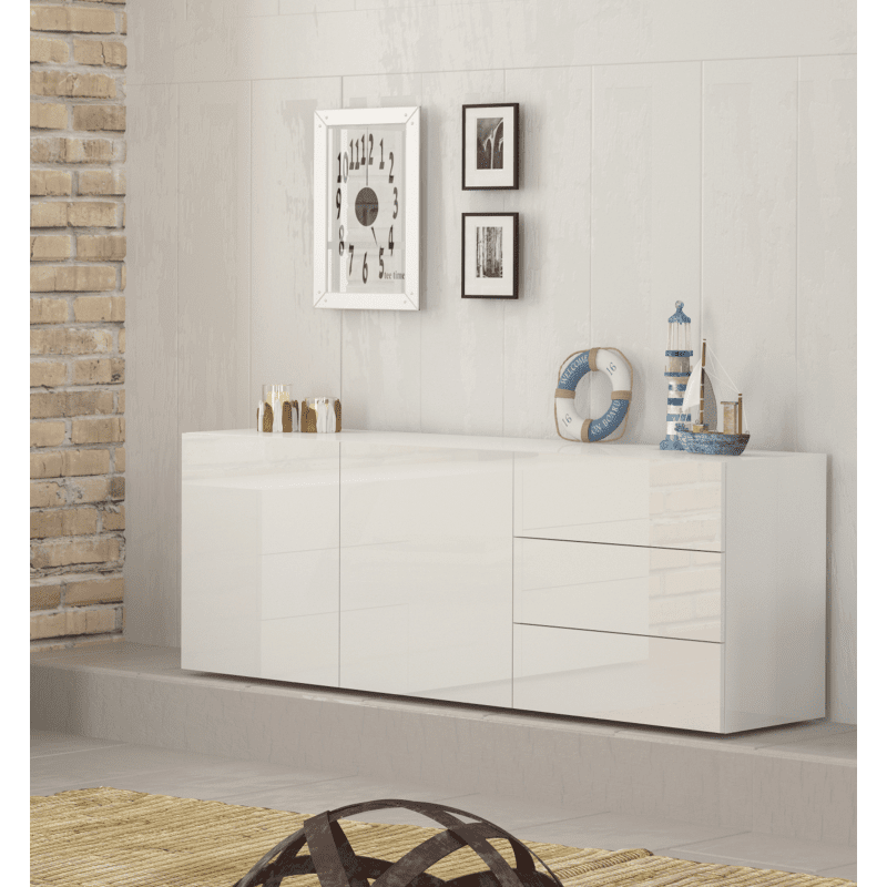 La struttura è costituita da due ante battenti con all’interno un grande ripiano in legno e da tre cassetti con apertura push-to-open.
