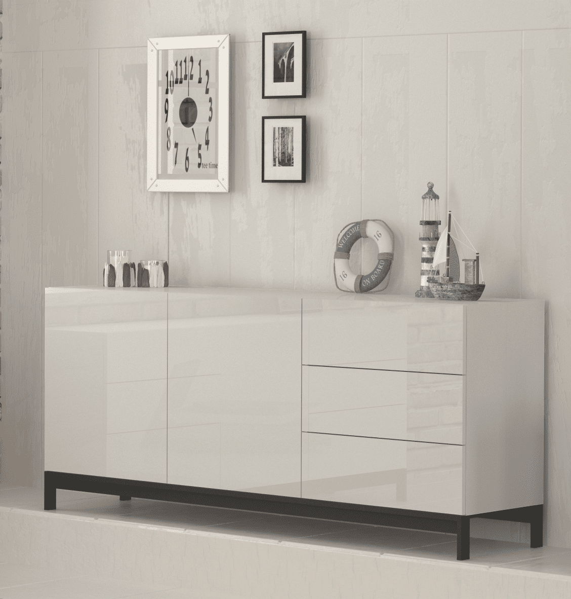 La struttura è costituita da due ante battenti con all’interno un grande ripiano in legno e da tre cassetti con apertura push-to-open.