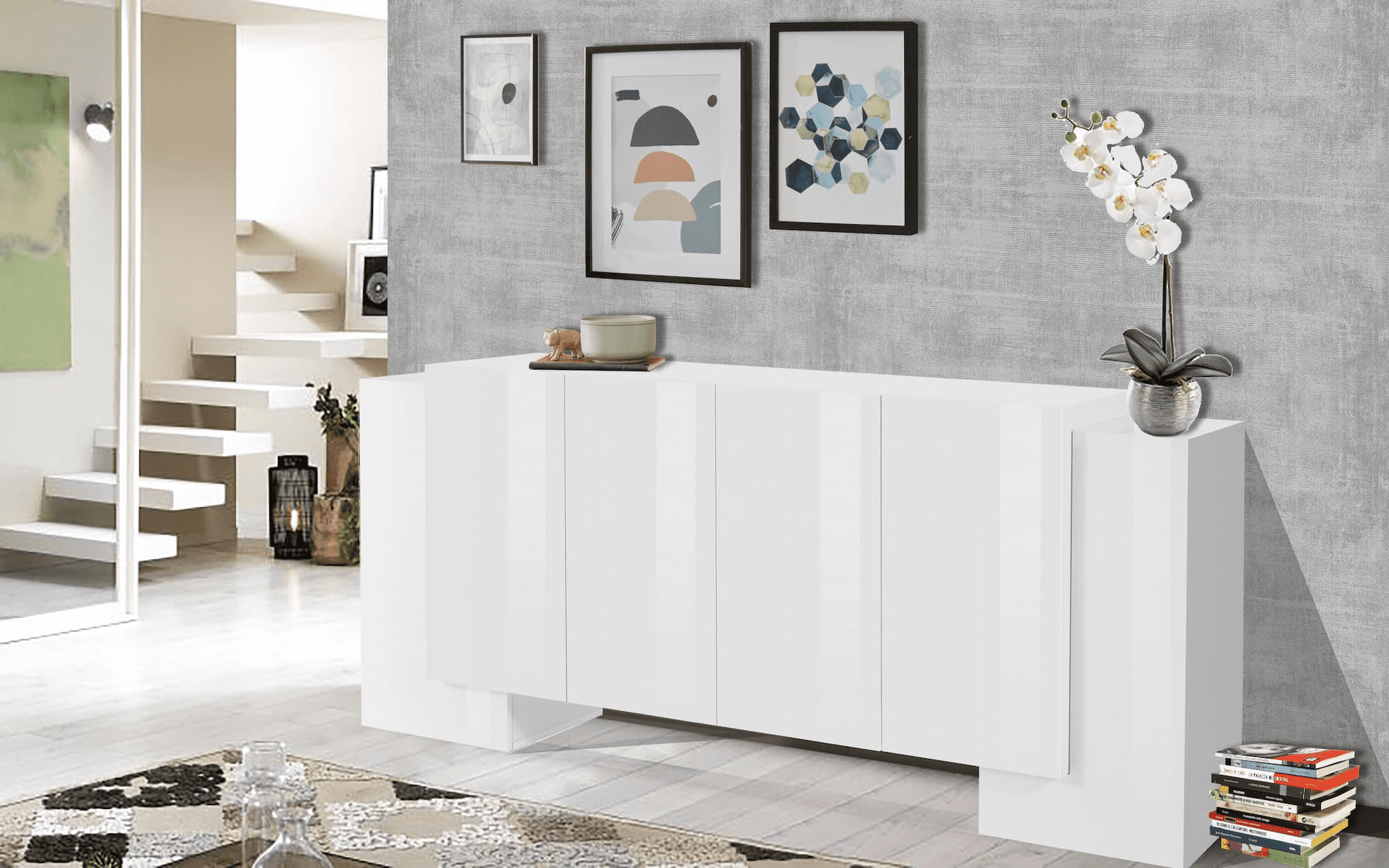 La credenza PILLON è costituita da 2 ante battenti a L con all’interno due ripiani in legno.