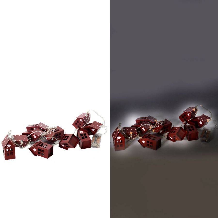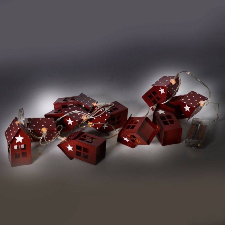 Questa decorazione a casetta di color rosso ha 10 micro led, con dei decori in metallo a forma di casetta.