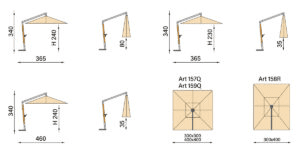 FIBRASOL WOOD, Dralon impermeabile ed antimuffa, pali in FIBRA DI VETRO mm 91×91, bacchette in FIBRA DI VETRO intercambiabili, base a T girevole 360°, manovella in alluminio.