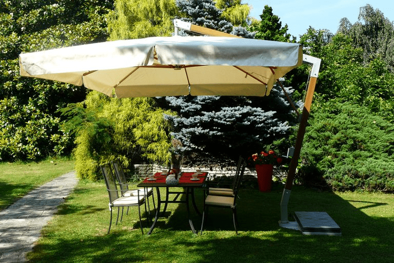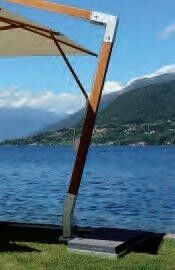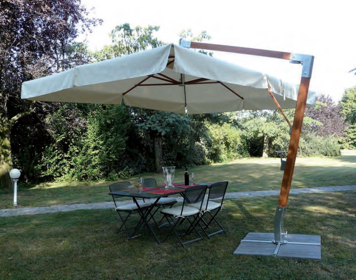 Ombrellone laterale con telaio, bastone e bacchette in fibra di vetro con finitura legno. Le sue grandi dimensioni gli permettono di essere utilizzato per coprire ampi spazi in giardini e piscine.