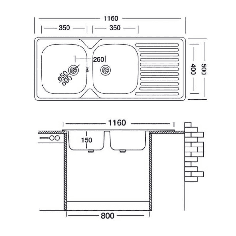Lavello 116×50 SA138 2 vasche e gocciolatoio destro
