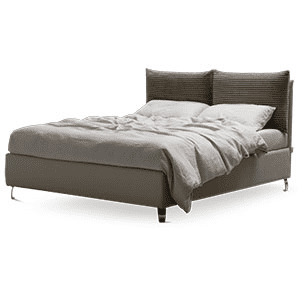 È un letto con una testata composta da due soffici cuscinoni, disponibili in vari tessuti, che possono essere coordinati con il letto tono su tono o in contrasto.