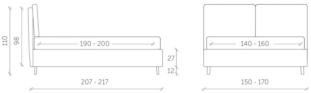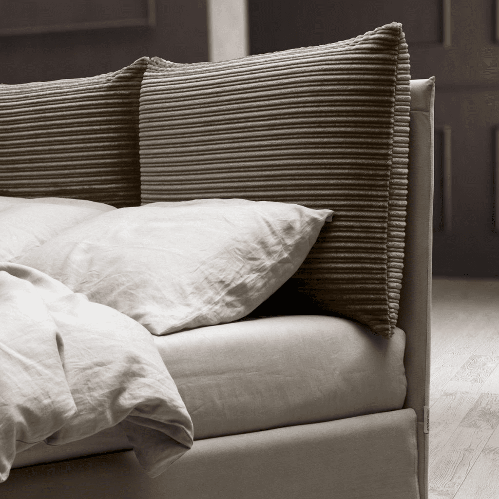 È un letto con una testata unica, caratterizzata da due soffici cuscinoni. Questi cuscini possono essere realizzati in una varietà di tessuti, permettendoti di scegliere tra abbinamenti tono su tono o audaci contrasti con il letto stesso. La praticità è garantita dagli inserti in velcro adesivo, che fissano saldamente i cuscini alla struttura, consentendo al contempo una facile e comoda rimozione per la pulizia o per cambiare il look della testata ogni volta che lo desideri.
