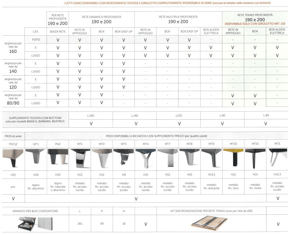 Piedini, rete, giroletto, misure o con eventuale armadio contenitore sono le modifiche principali praticabili.