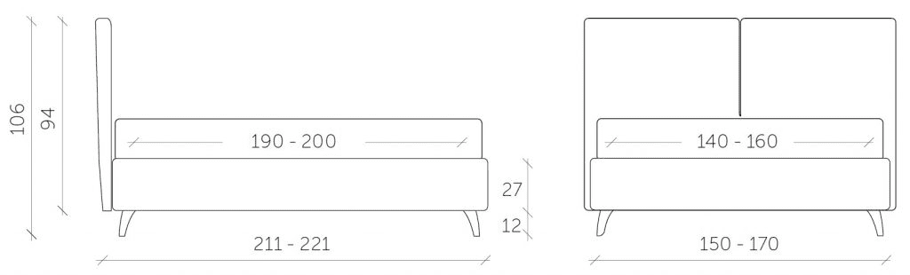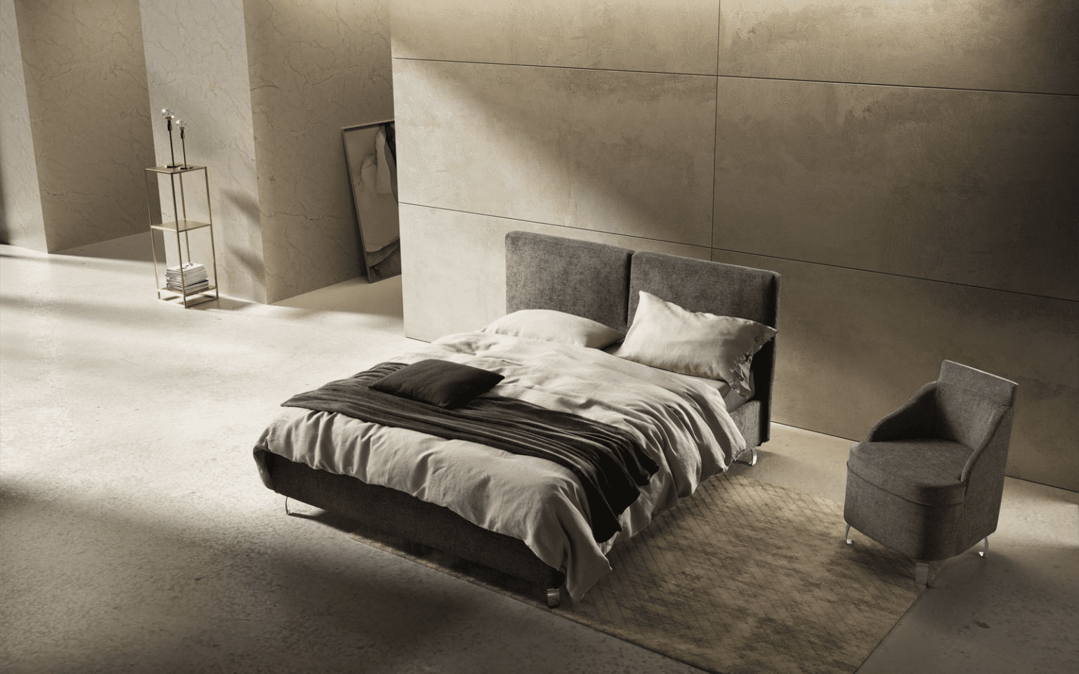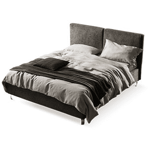 È un letto dalla soffice testata ottenuta grazie ad una speciale imbottitura. La testata è un monoscocca diviso in due centralmente ed ha una leggera inclinazione obliqua che offre una linea particolarmente pulita e gradevole.