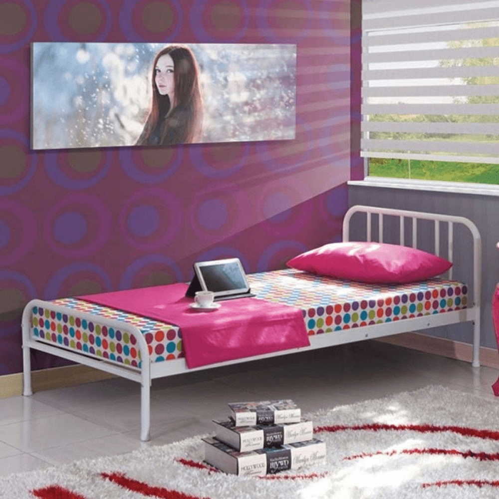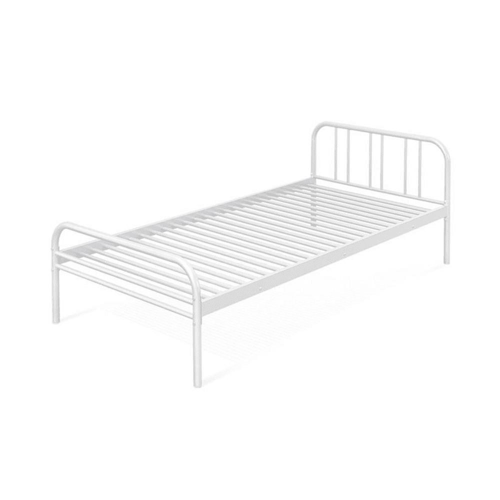 Letto singolo in metallo bianco, caratterizzato da un design semplice e lineare ma allo stesso tempo da una struttura solida e stabile. Le doghe sono in metallo e verniciate di colore bianco
