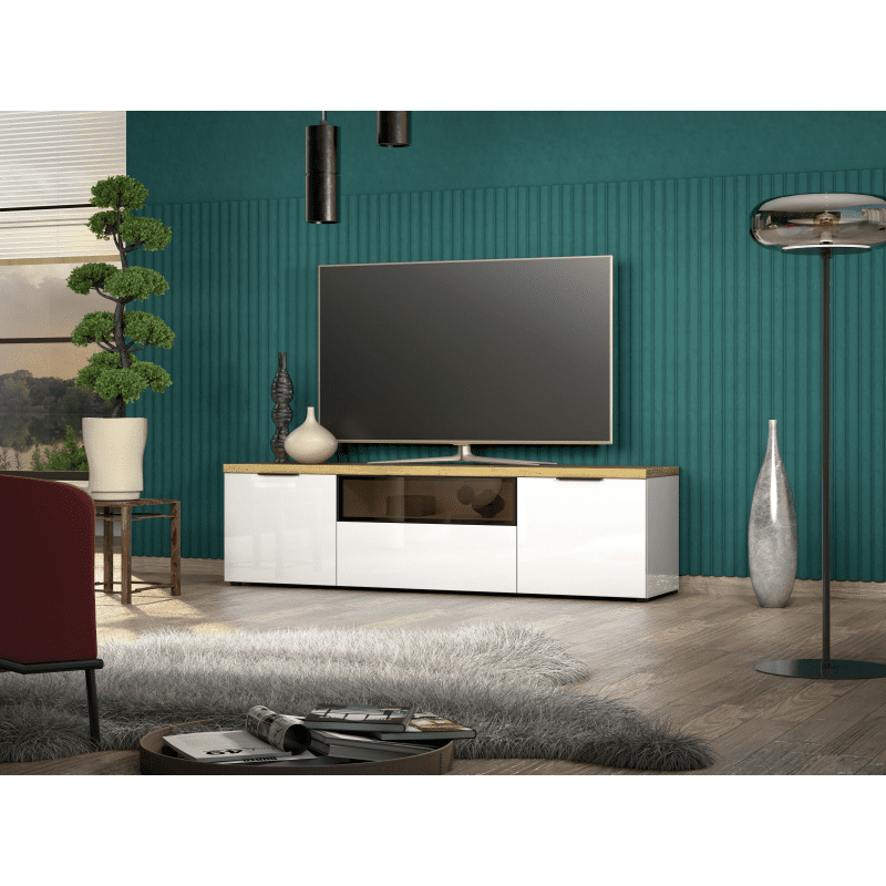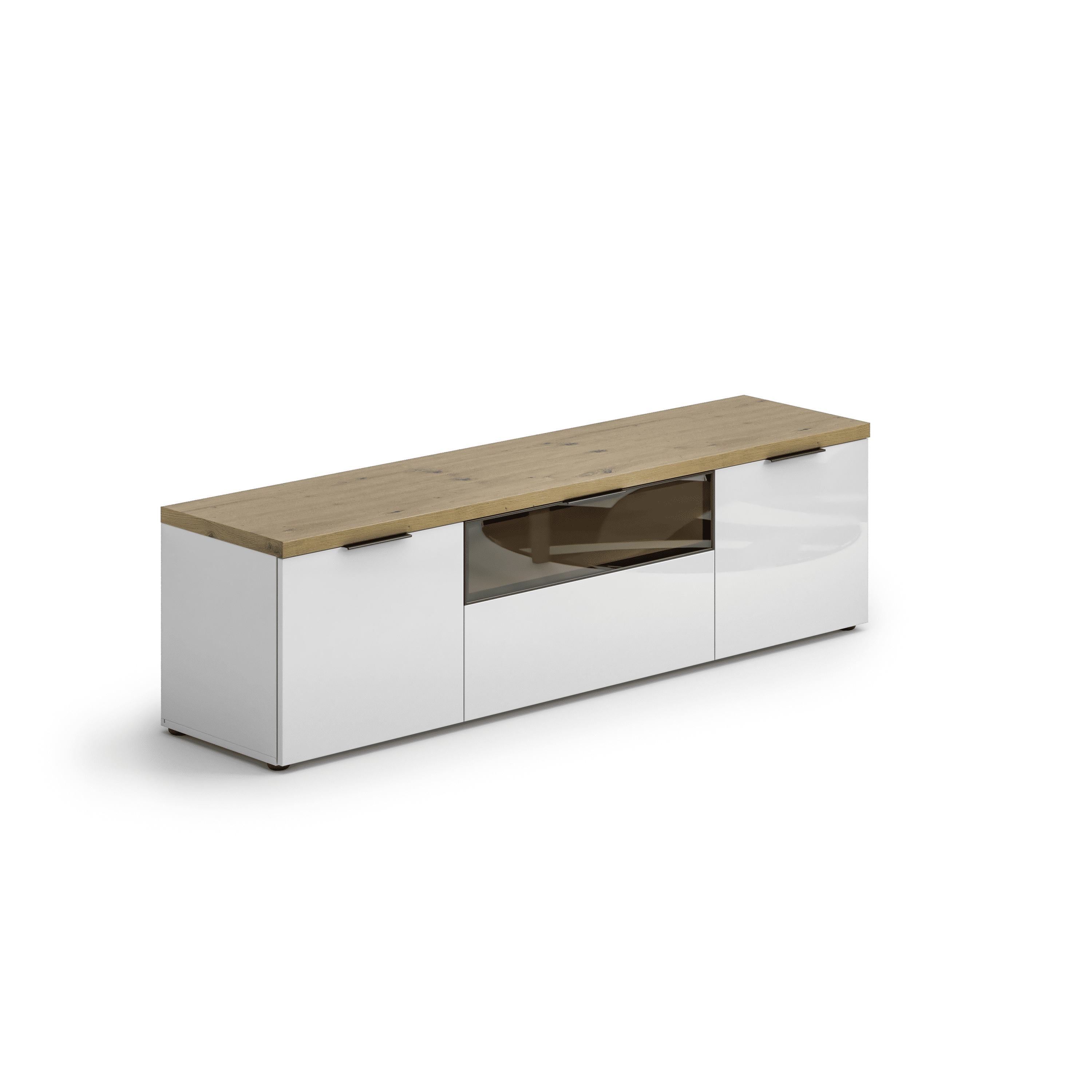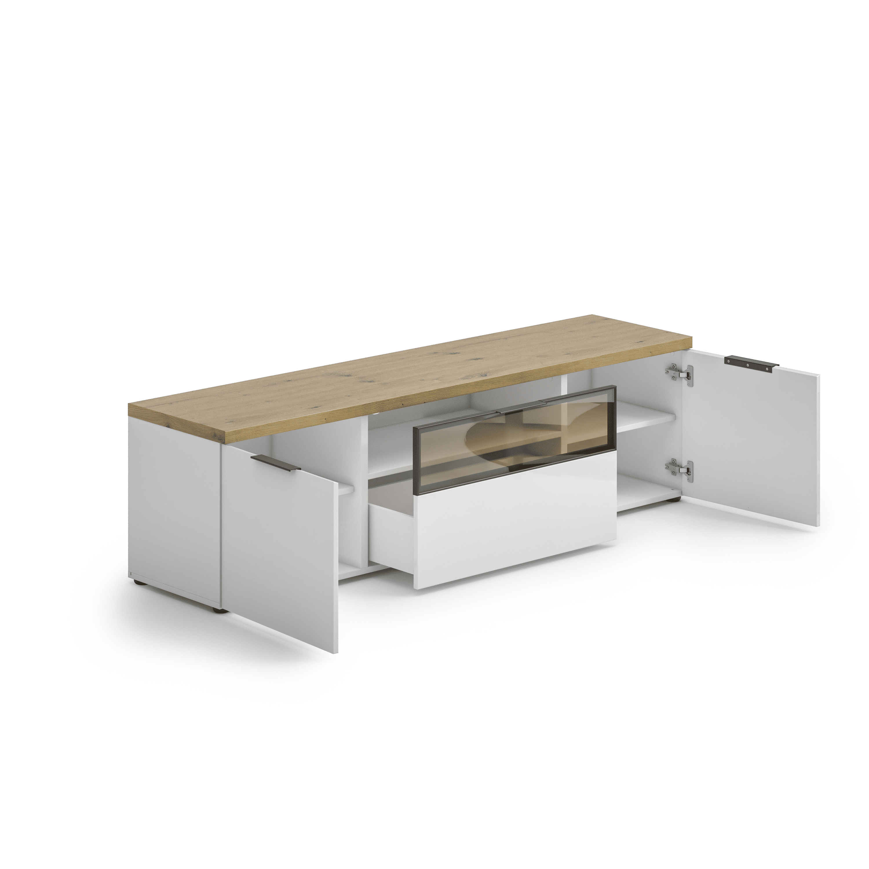Realizzato in bianco lucido, con eleganti dettagli in antracite e legno, questo lowboard moderno si adatta perfettamente a ogni ambiente contemporaneo.