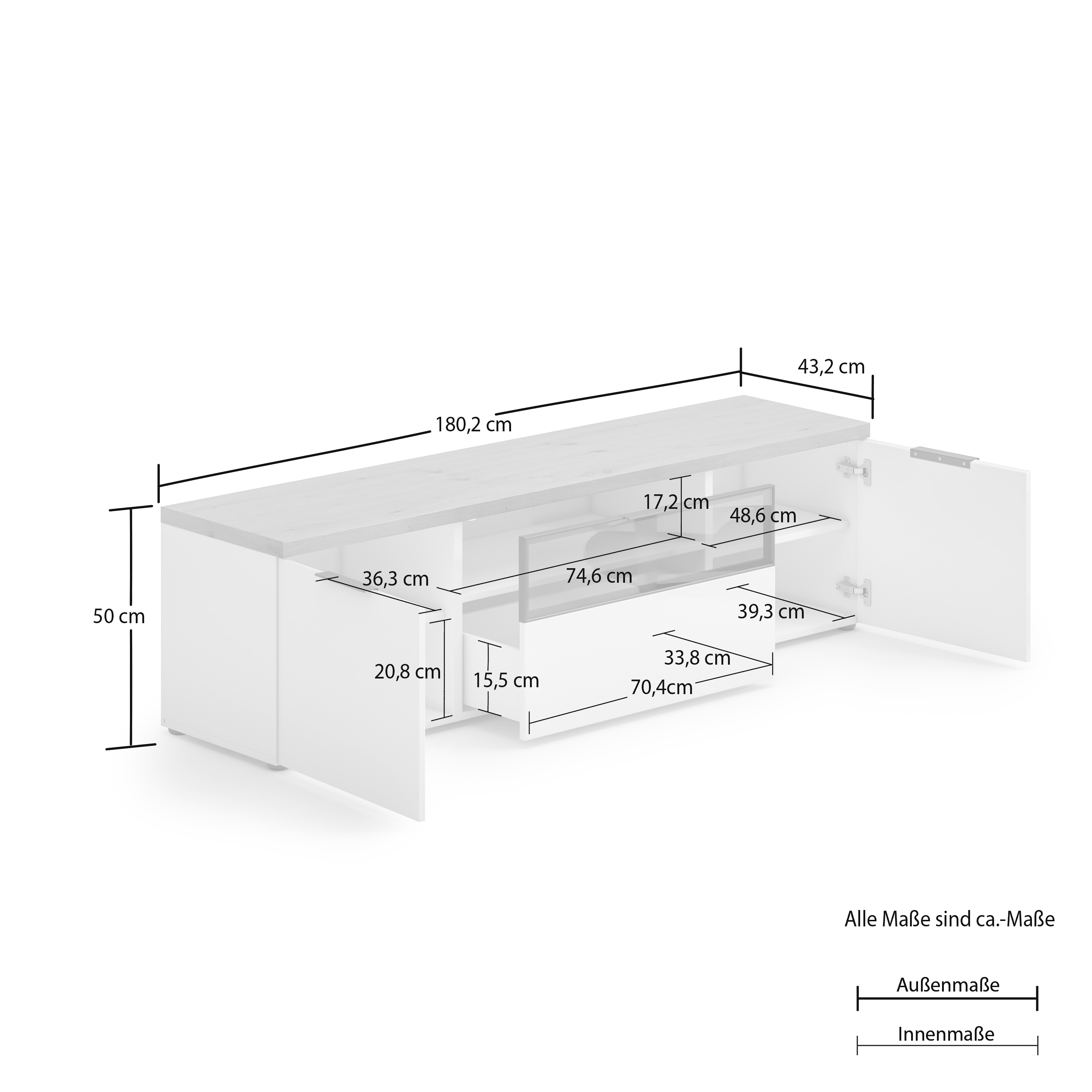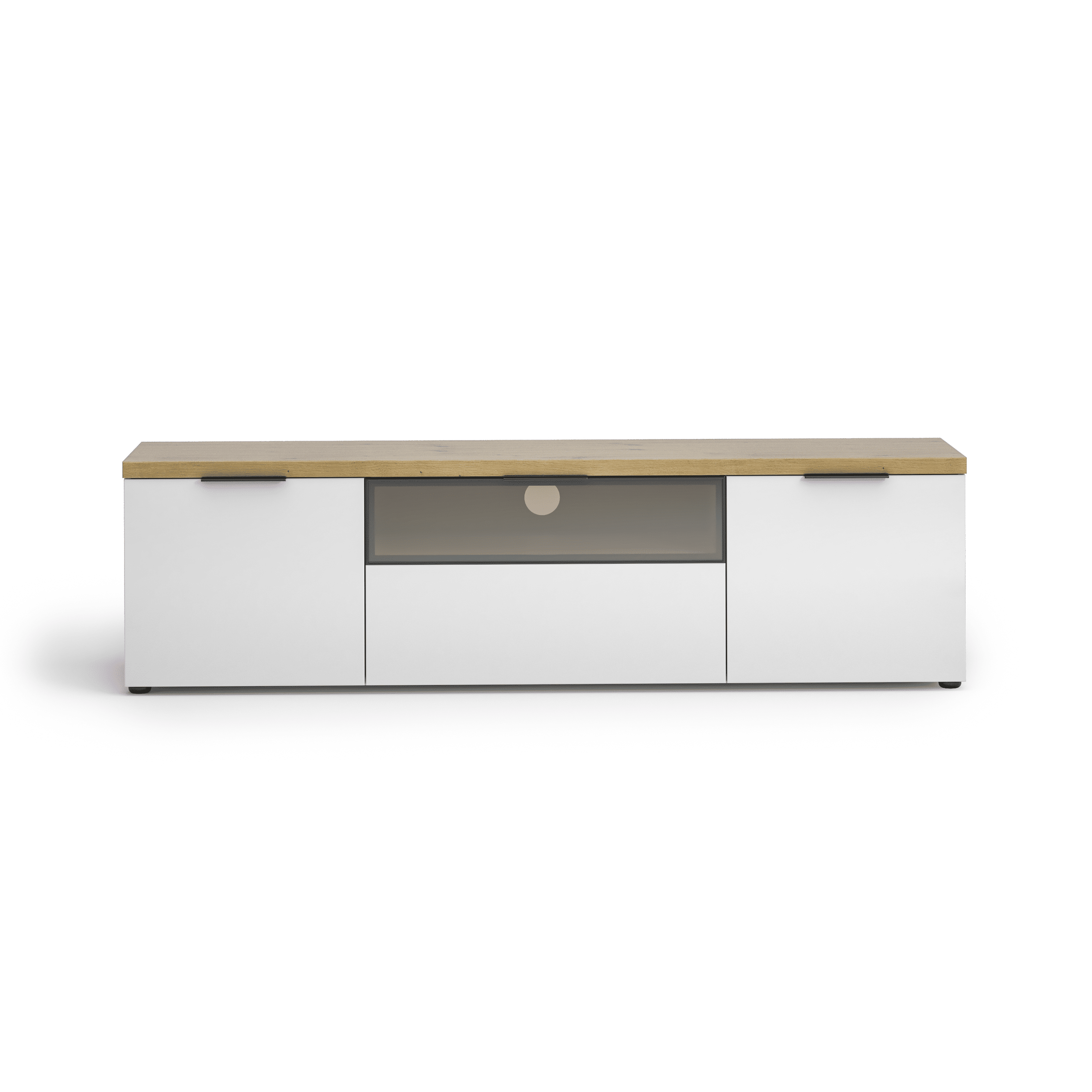 Con una lunghezza di 180 cm, offre due ampi vani chiusi da ante e una spaziosa superficie per ospitare un televisore di grandi dimensioni. I comparti interni sono perfetti per organizzare oggetti di vario tipo, mantenendoli protetti dalla polvere e sempre ordinati.