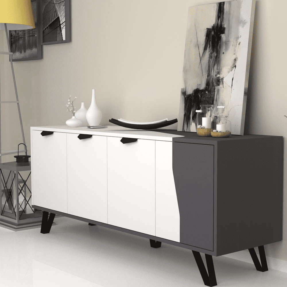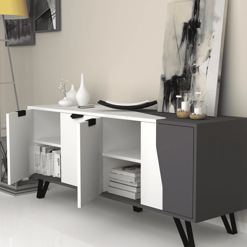 Madia dal design unico. Il colore bianco viene macchiato dalla tinta ghisa in modo irregolare, conferendo un gioco di forme davvero originale. Anche la particolare forma dei piedini e delle maniglie in metallo nero, rendono questa madia davvero esclusiva. Dotata di 4 ante e vani molto capienti.
