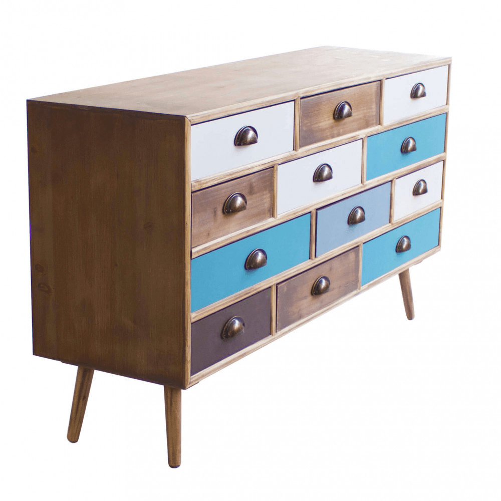 Struttura in MDF, gambe in legno di pino, top colore NATURALE 12 cassetti colorati