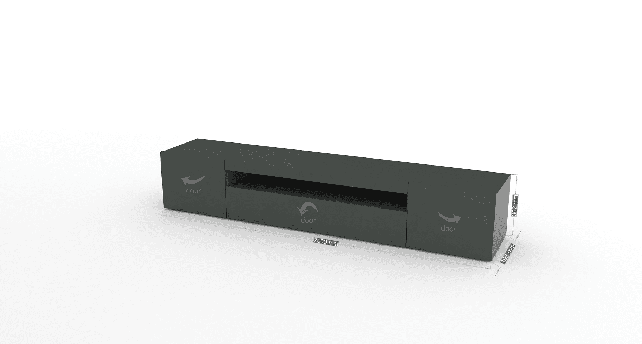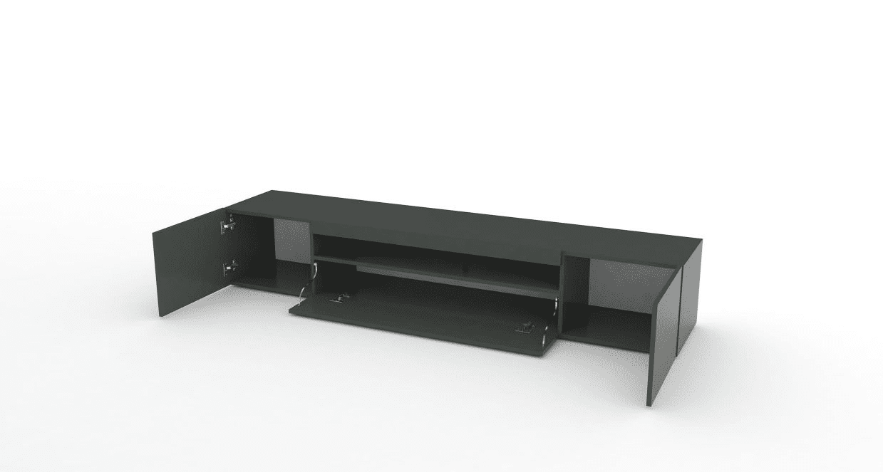La struttura solida e robusta presenta un ampio piano lungo 200 cm, ideale per ospitare televisori di grandi dimensioni. Dotato di 3 sezioni contenitive, 2 ante laterali e un’anta centrale a ribalta, offre spazio per conservare tutti i tuoi accessori e oggetti di uso quotidiano. Inoltre, nella parte superiore troverai un vano a giorno capiente. Il tutto, impreziosito da frontali in melaminico antracite lucido, conferisce al mobile un’eleganza senza tempo e facilità di pulizia.