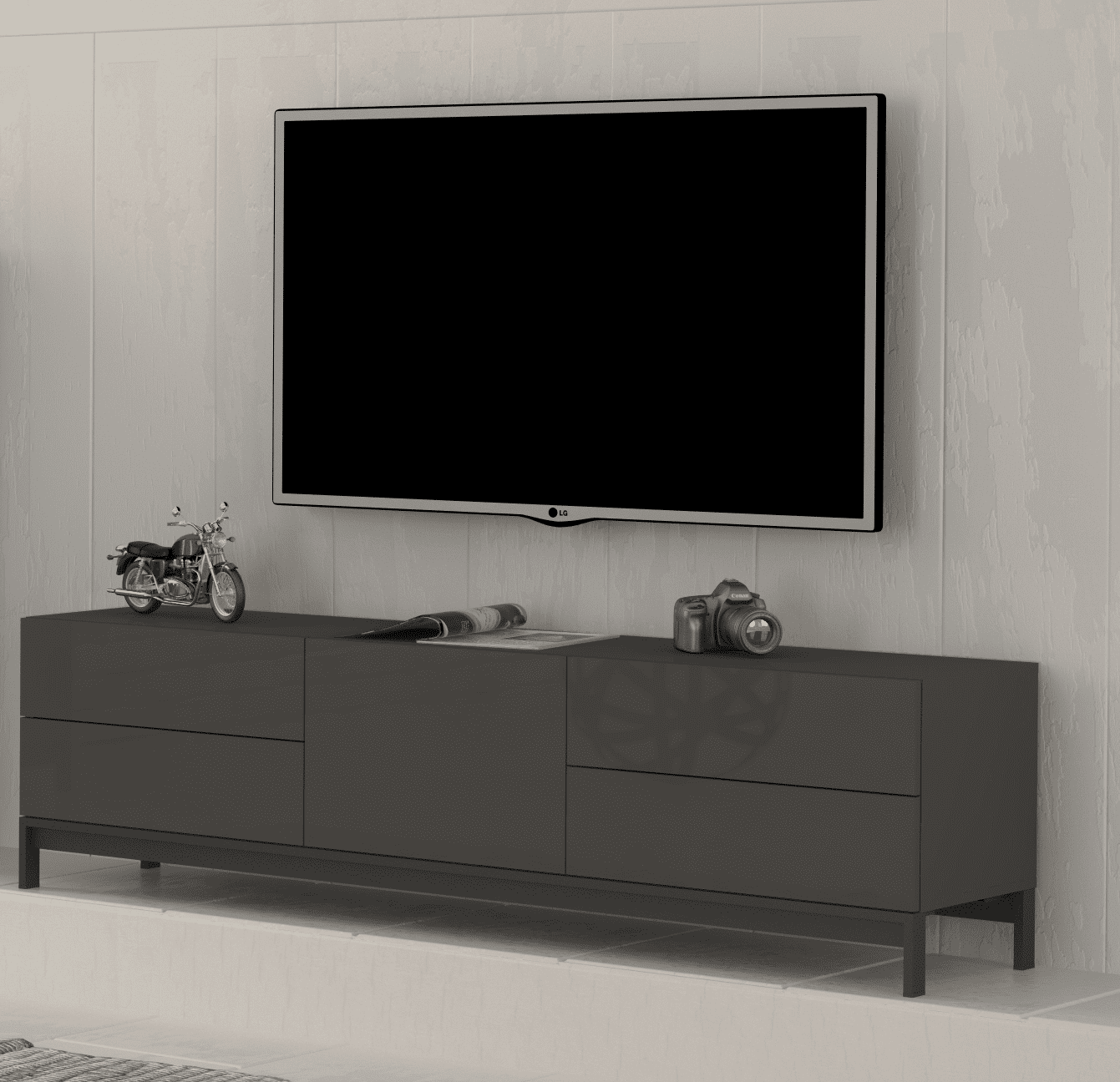 La struttura è costituita da un mobile basso, ampio e solido con un piano lungo 170 cm che può formare la base d’appoggio di televisori di grandi dimensioni.