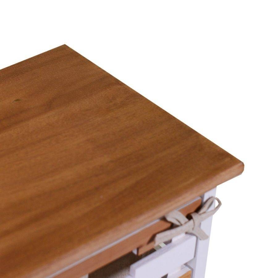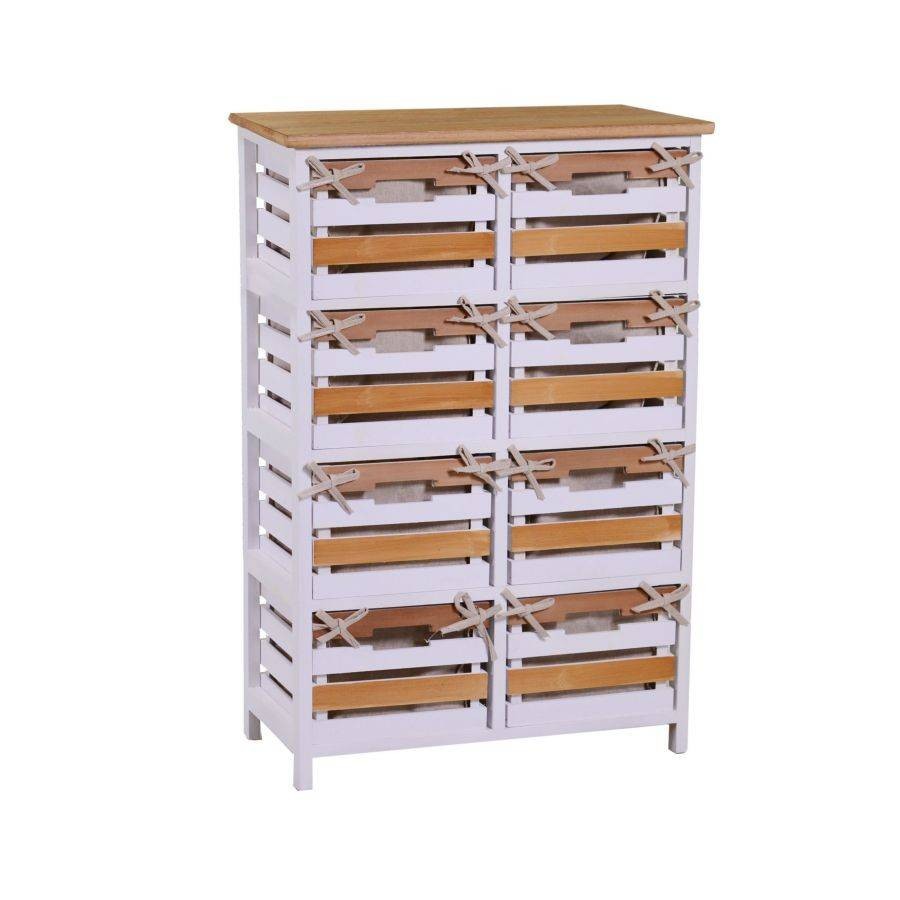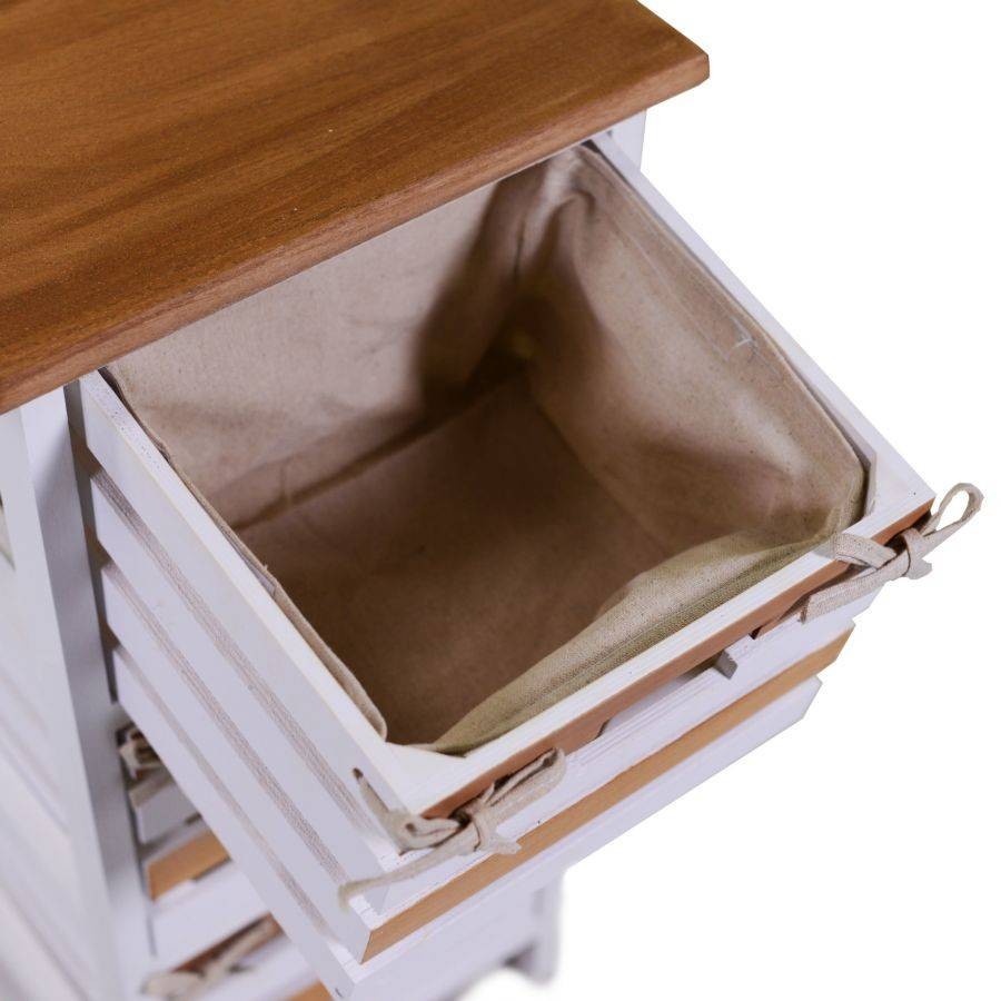 La struttura è in legno nei colori del bianco e marrone con dei fiocchetti sui lati di color beige, è inoltre dotato di una fodera interna color crema. E’ dotato di 8 cassetti portaoggetti disposti su due colonne.