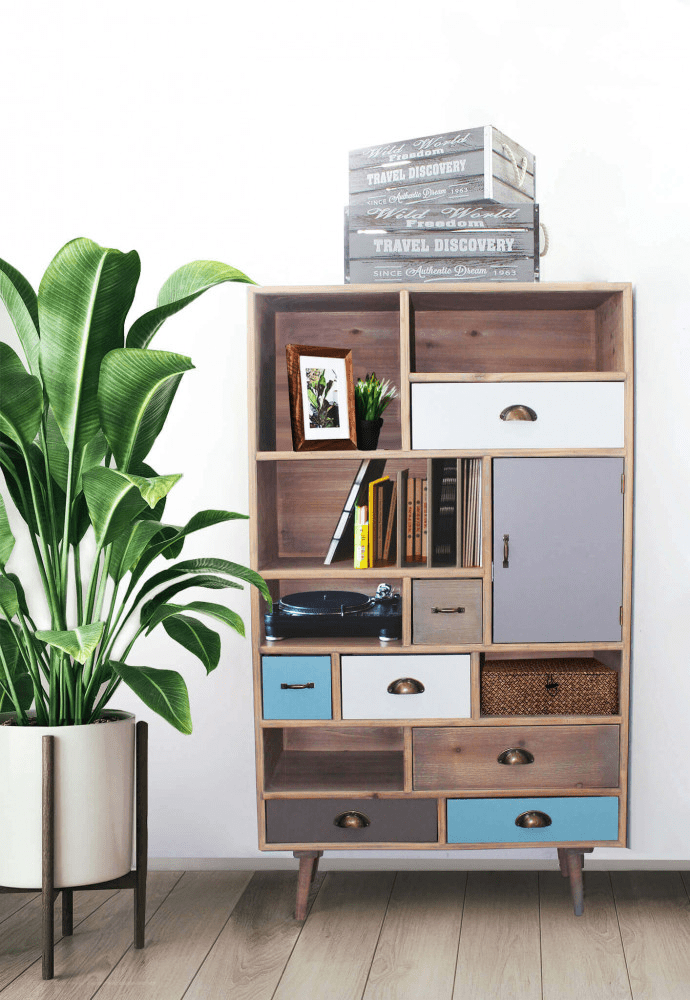 Struttura in MDF, gambe in legno di pino, top colore NATURALE 6 ripiani e 1 anta, 7 cassetti colorati