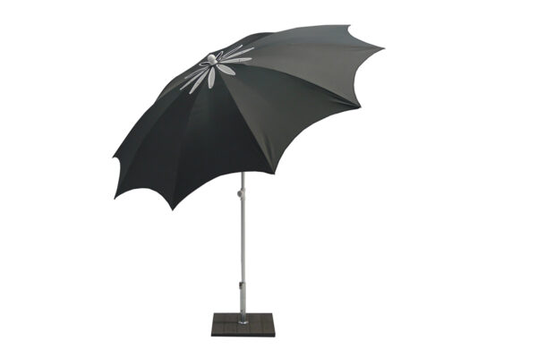 Ombrellone di design made in Italy dall’aspetto distintivo é caratterizzato da un ricamo posizionato vicino alla punta, che proietta un motivo floreale sia a terra che sul tavolo.