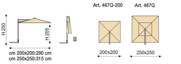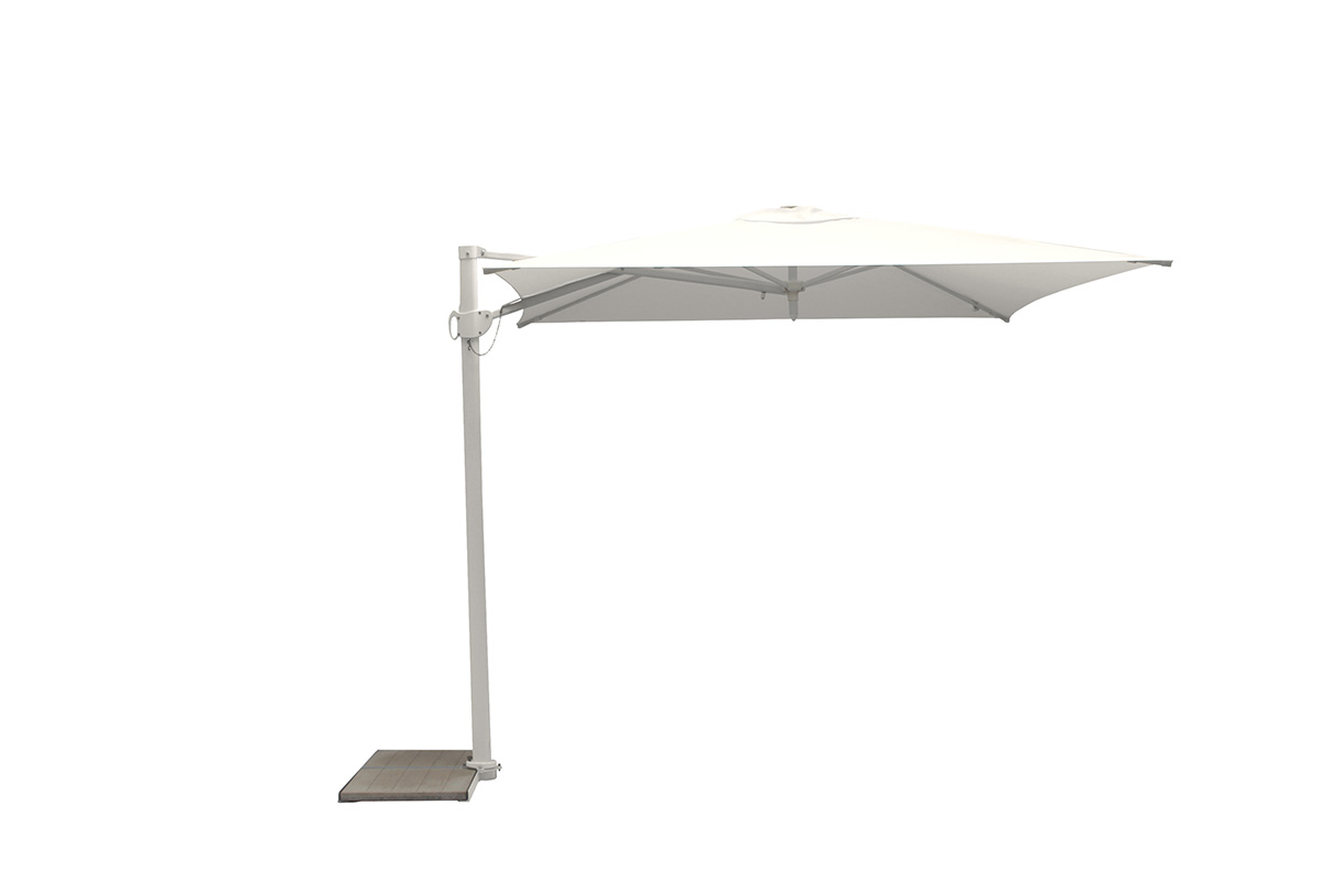 Ombrellone laterale di design retrattile e compatto con struttura bianca, apertura senza corde e/o manovelle, girevole, base a T.
