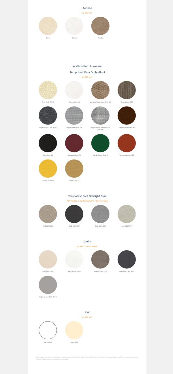 Tessuto di Alta Qualità: Scegli tra Acrilico 100%, Tempotest® Parà o PVC ignifugo e impermeabile, tutti trattati per resistere a muffa, idrorepellenza e agenti atmosferici, garantendo una lunga durata.