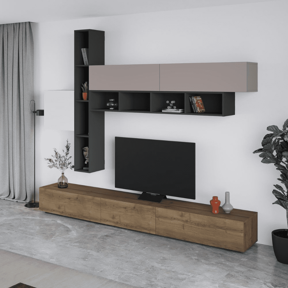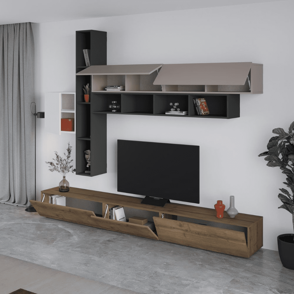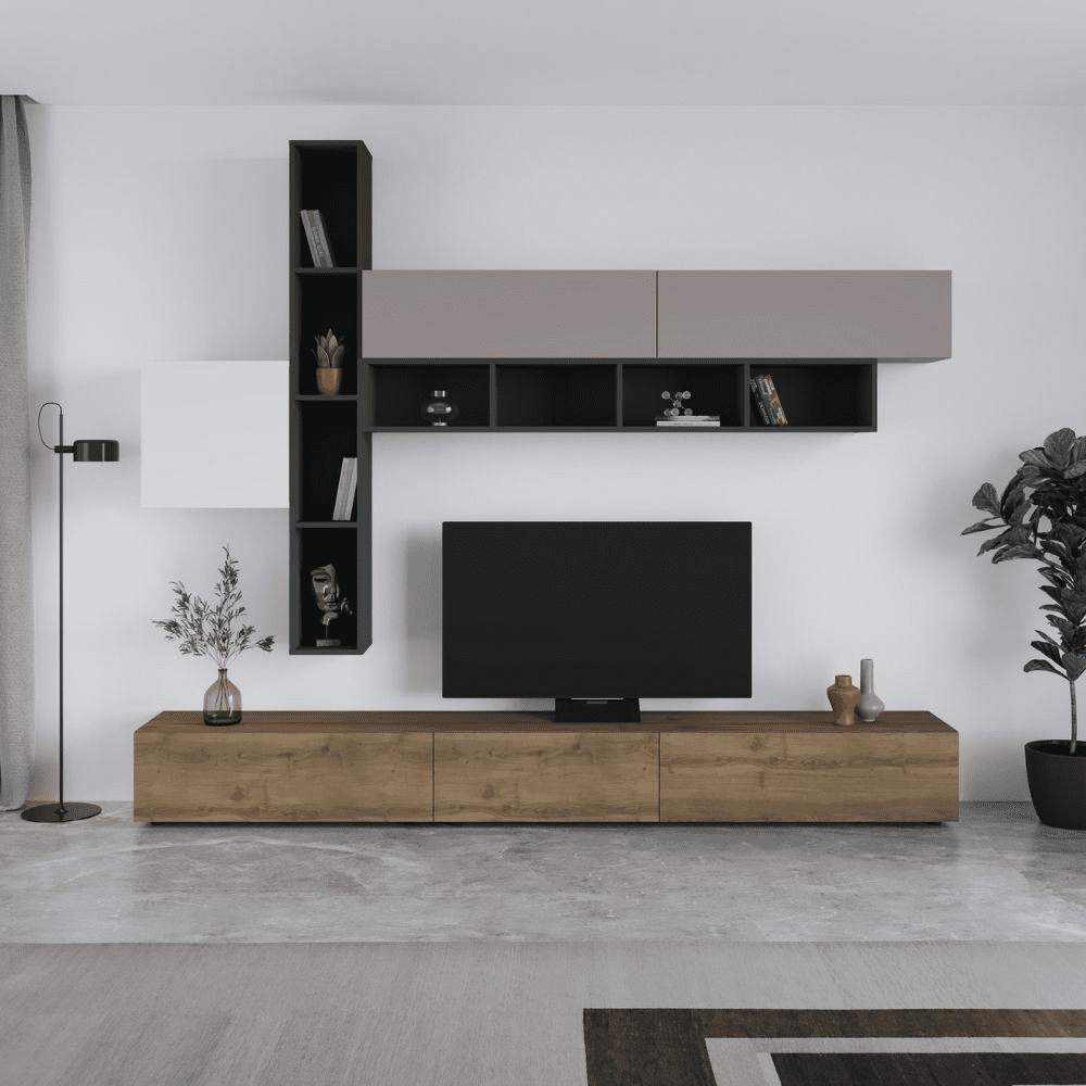 Parete attrezzata Fashion base colore hitit noce e pensili antracite, bianco e light mocha H 205x40x275 cm.