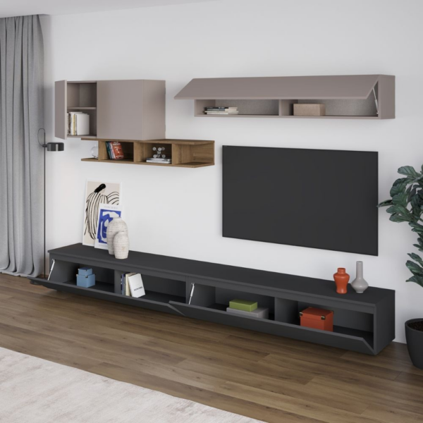 Parete attrezzata Monica colore antracite con dettagli light mocha e hitit noce