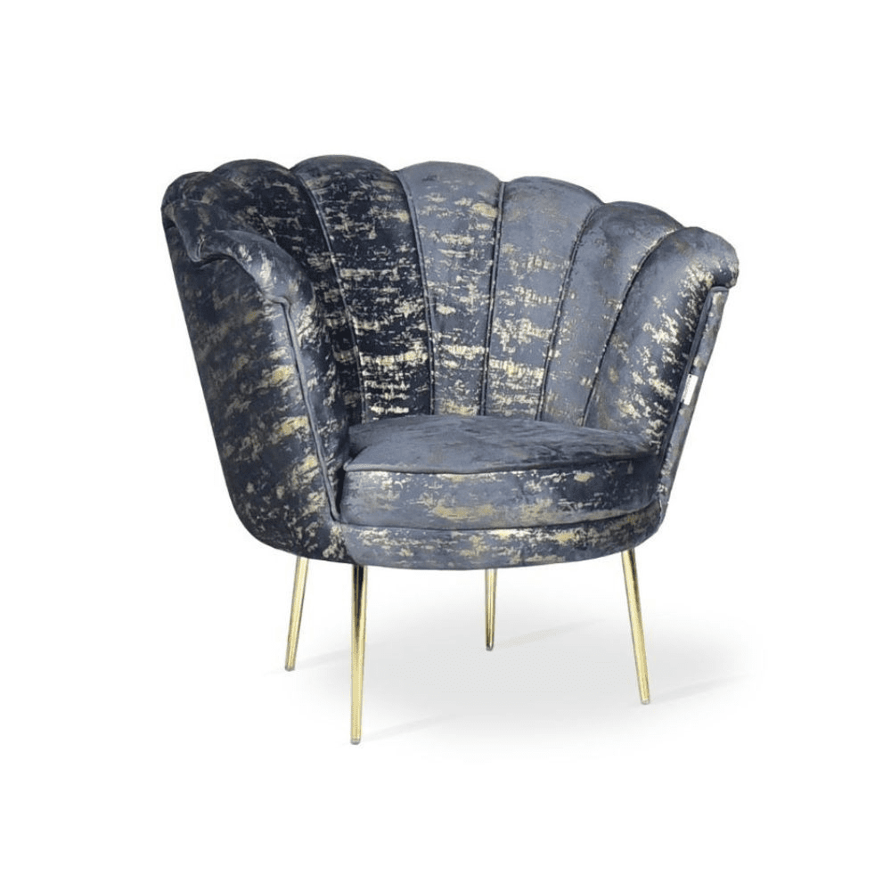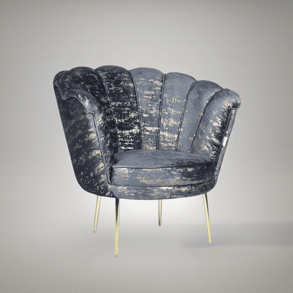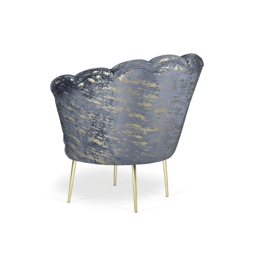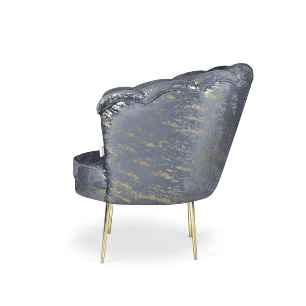 Poltrona Orel in velluto antracite con fantasia oro Arya Gold 29 bordo antracite e piedini oro