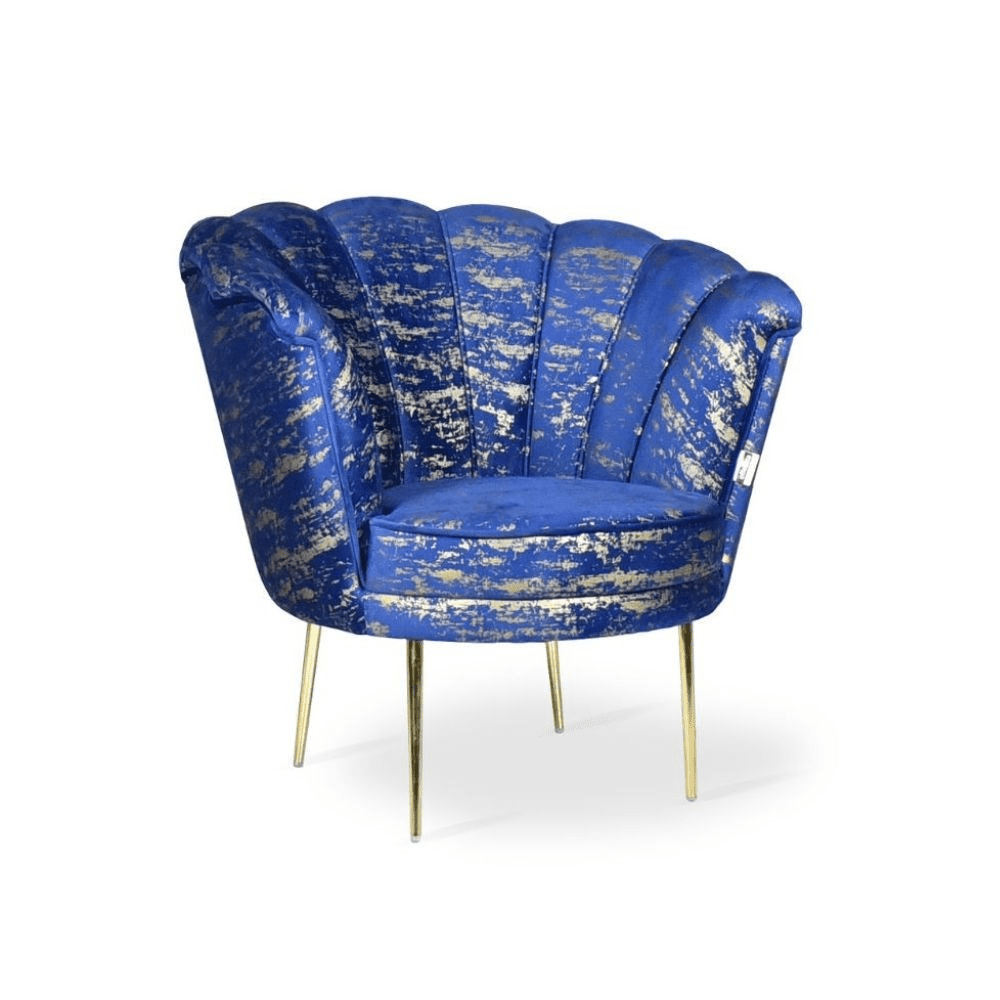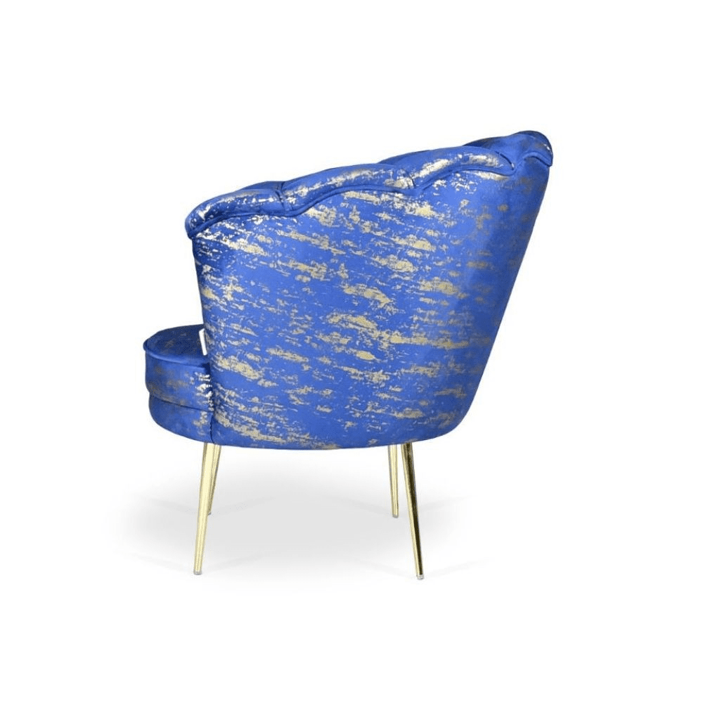 Poltrona Orel in velluto blu con fantasia oro Arya Gold 24 bordo blu e piedini oro