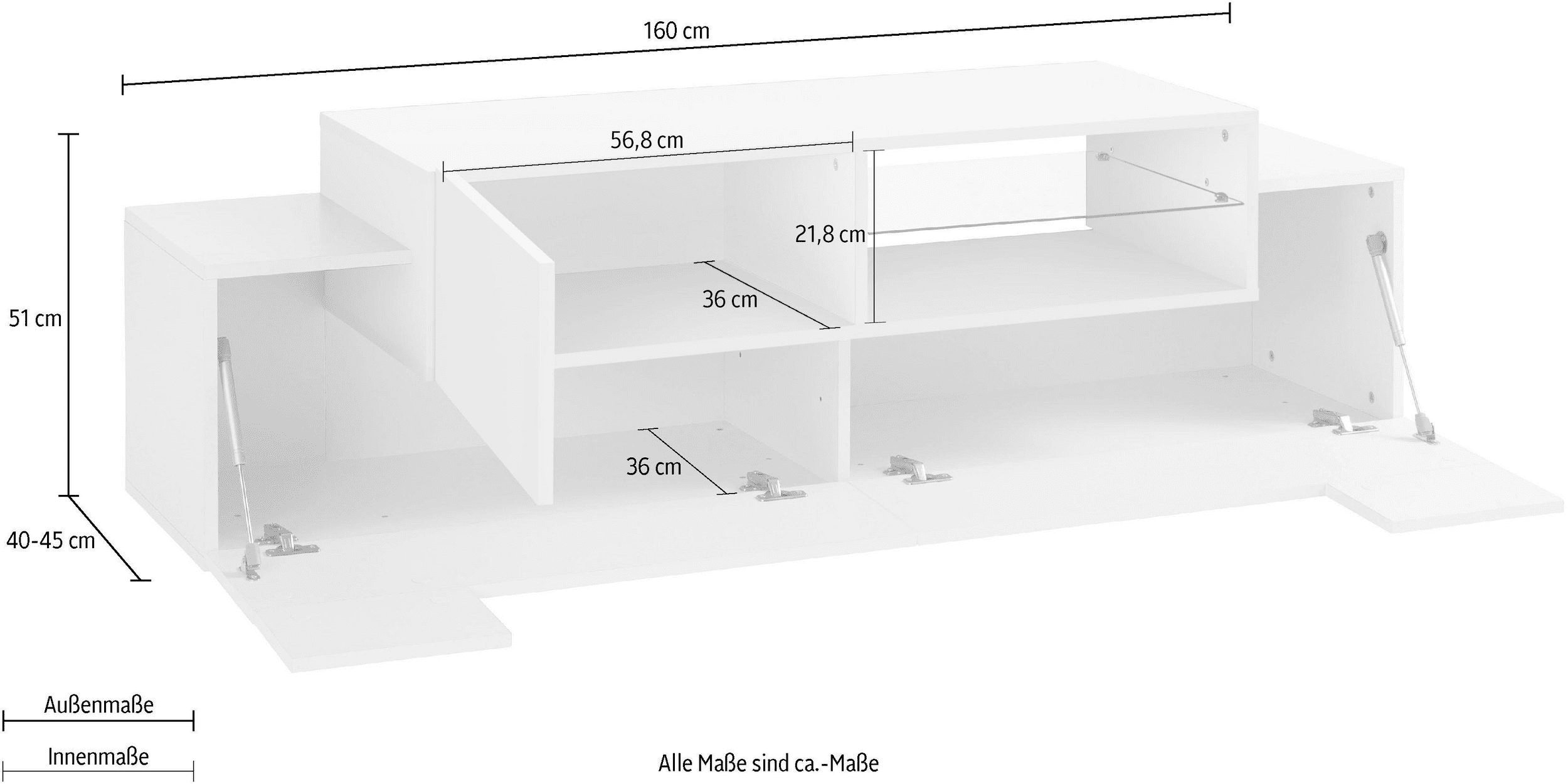 Il porta TV NEW CORO è costituito da 2 ante battenti ad L e nella la struttura centrale c’è un’anta battente ed un vano a giorno con un ripiano in vetro.