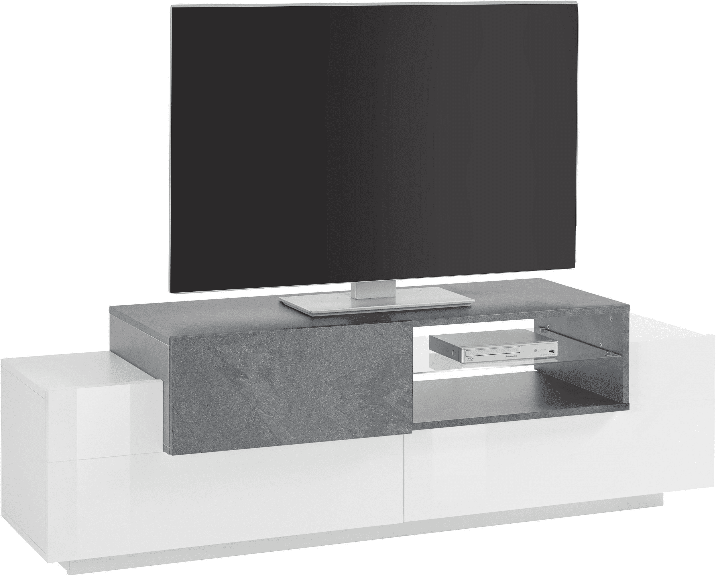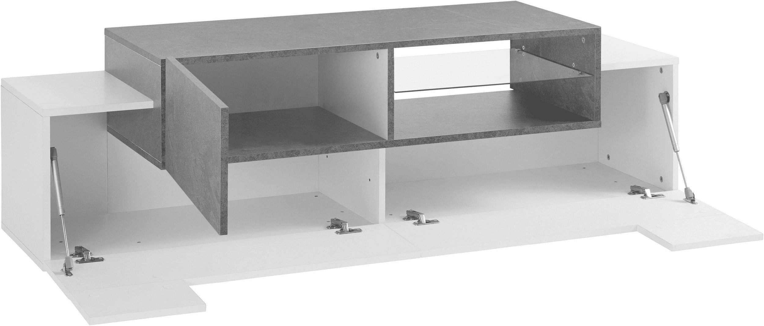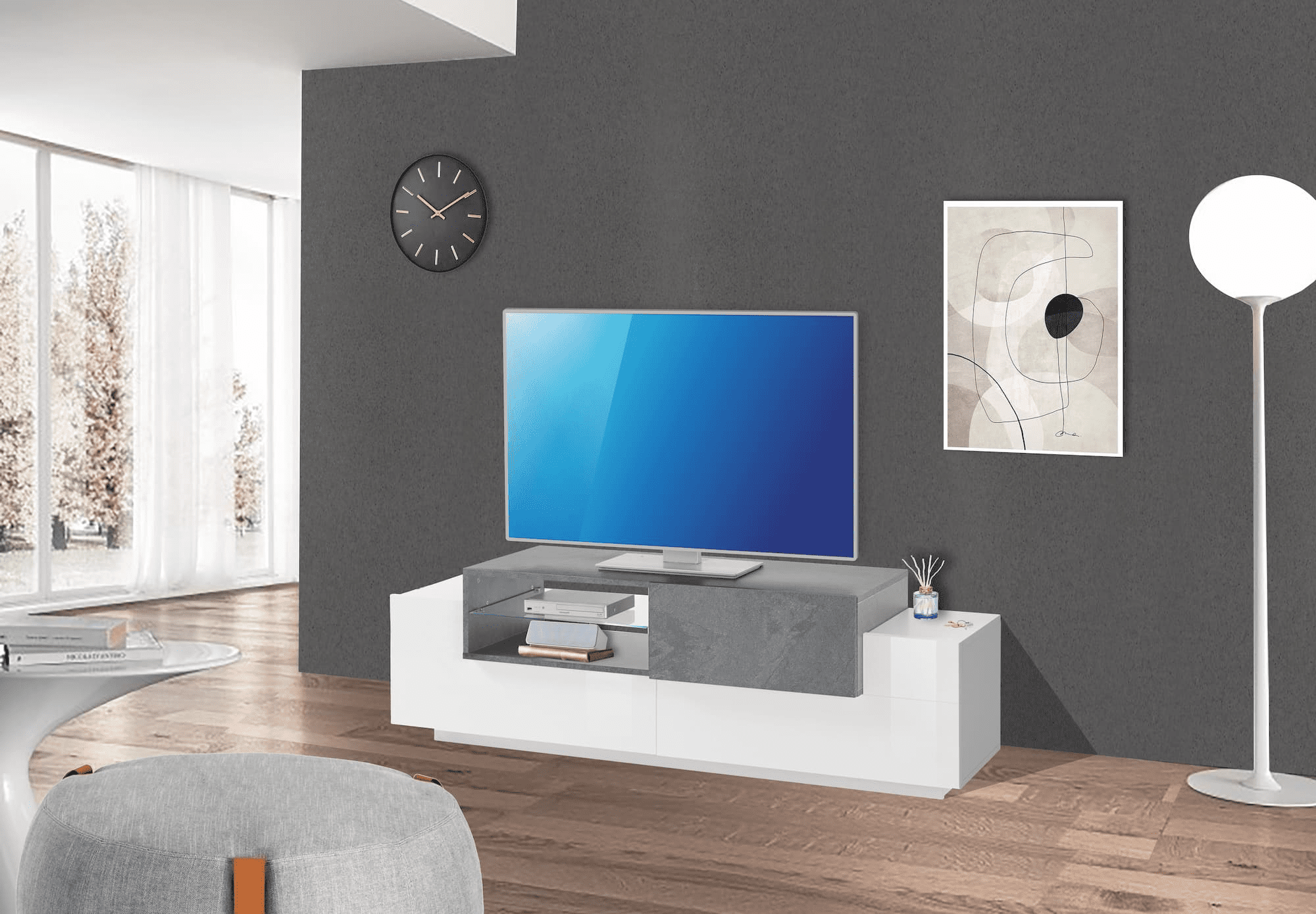 Il porta TV NEW CORO è costituito da 2 ante battenti ad L e nella la struttura centrale c’è un’anta battente ed un vano a giorno con un ripiano in vetro.