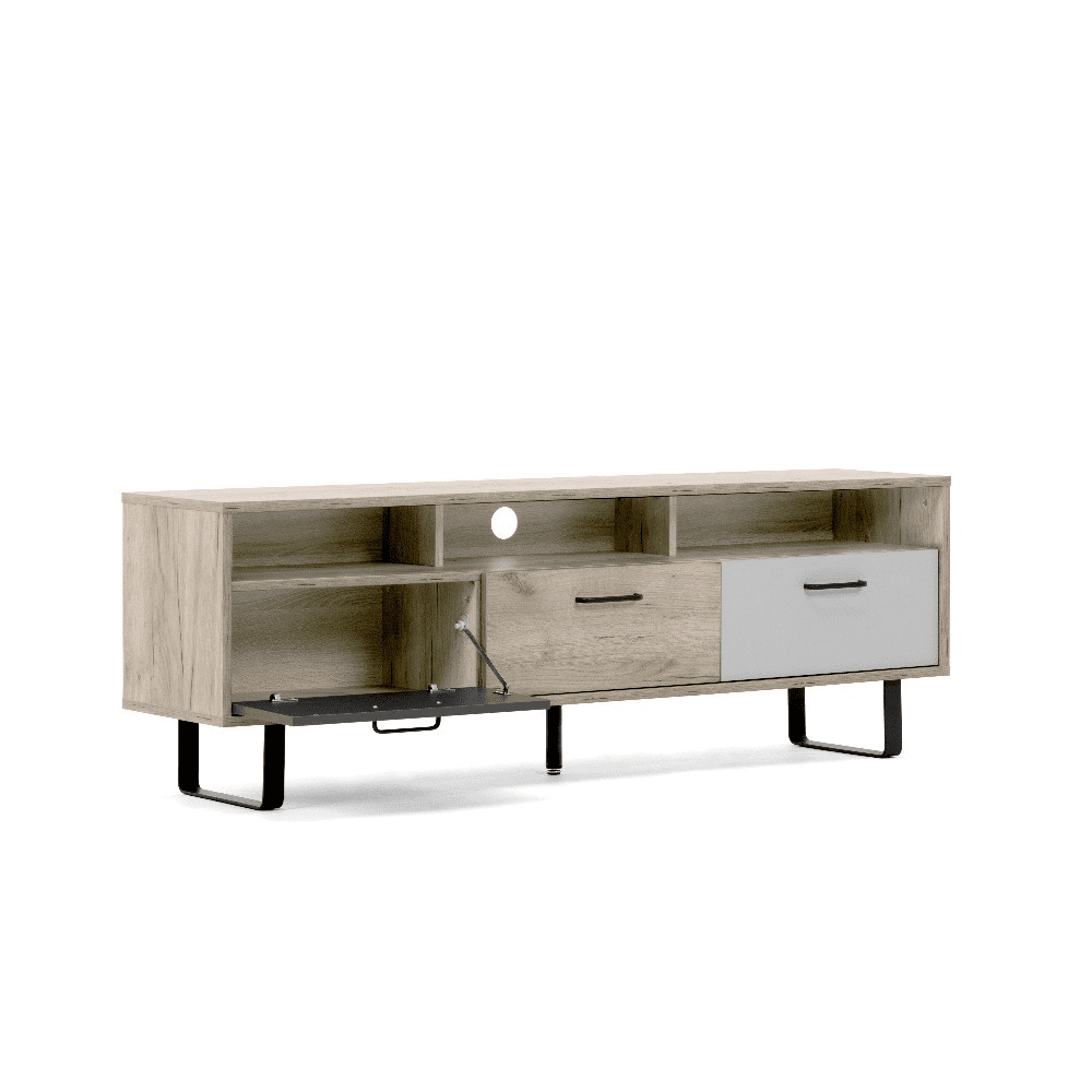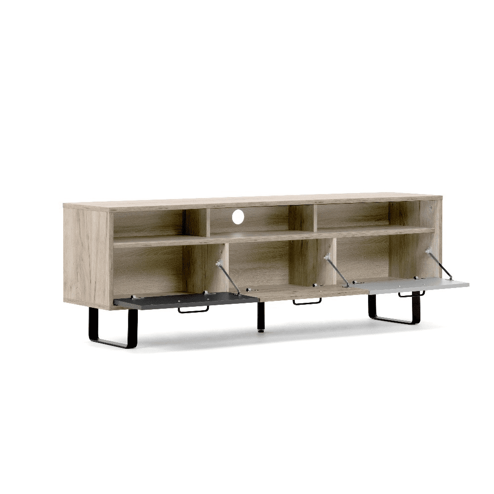 Composto da 3 ante a ribalta che nascondono vani capienti e un lungo vano a giorno diviso in 3 parti.