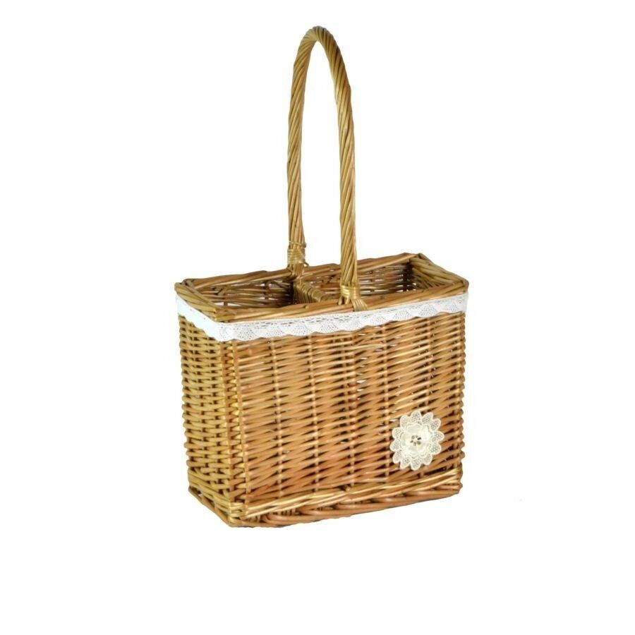 La cesta è in vimini con sul contorno un decoro in pizzo bianco e un fiore in basso.
