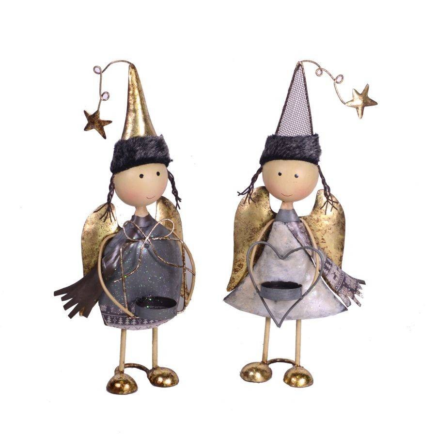 Set di due angioletti in metallo con portacandele in mano.